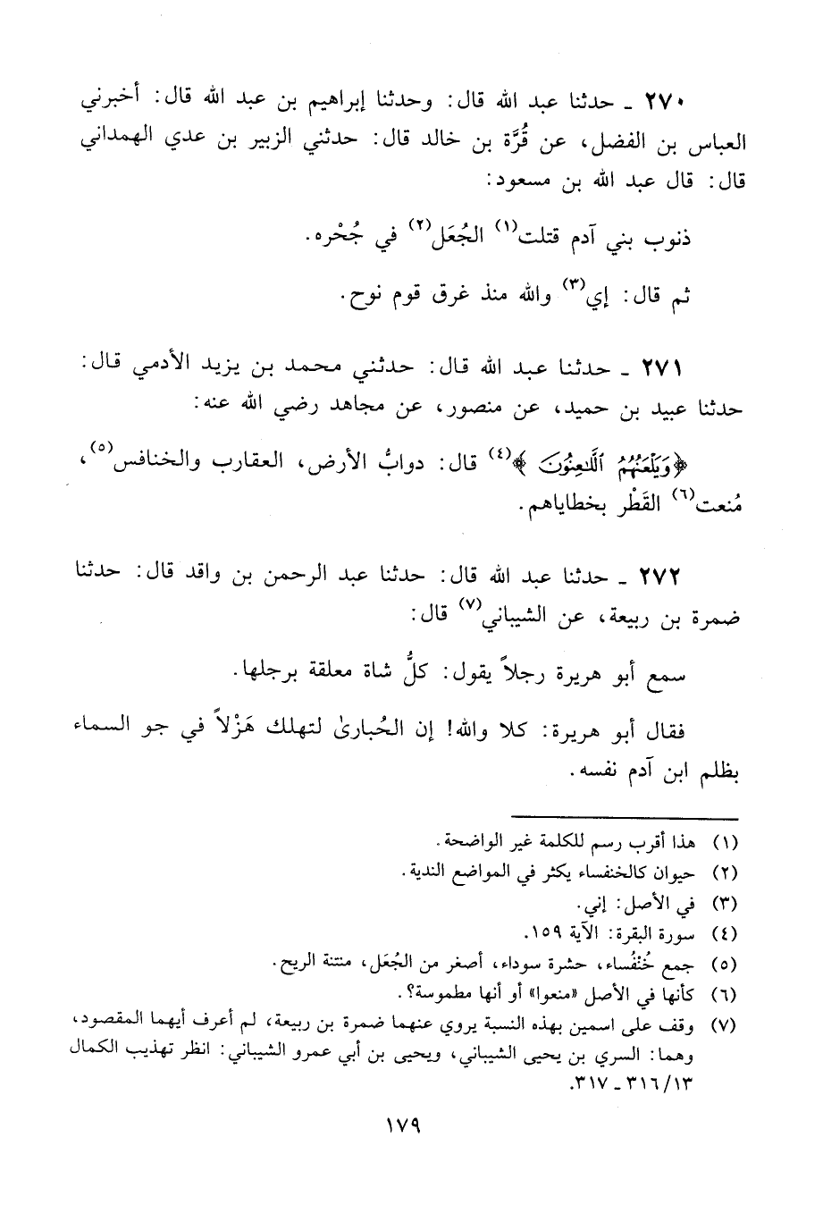 270 - حَدَّثَنَا عَبْدُ اللَّهِ قَالَ: وَحَدَّثَنَا إِبْرَاهِيمُ بْنُ عَبْدِ اللَّهِ، قَالَ: أَخْبَرَنِي الْعَبَّاسُ بْنُ الْفَضْلِ، عَنْ قُرَّةَ بْنِ خَالِدٍ، قَالَ: حَدَّثَنِي الزُّبَيْرُ بْنُ عَدِيٍّ الْهَمْدَانِيُّ، قَالَ: قَالَ عَبْدُ اللَّهِ بْنُ مَسْعُودٍ: " §ذُنُوبُ بَنِي آدَمَ قَتَلَتِ الْجُعَلَ فِي جُحْرِهِ، ثُمَّ قَالَ: إِي وَاللَّهِ مُنْذُ غَرَقَ قَوْمُ نُوحٍ "