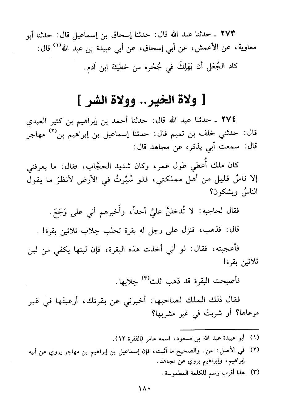 274 - حَدَّثَنَا عَبْدُ اللَّهِ قَالَ: حَدَّثَنَا أَحْمَدُ بْنُ إِبْرَاهِيمَ بْنِ كَثِيرٍ الْعَبْدِيُّ، قَالَ: حَدَّثَنِي خَلَفُ بْنُ تَمِيمٍ، قَالَ: حَدَّثَنَا إِسْمَاعِيلُ بْنُ إِبْرَاهِيمَ بْنِ مُهَاجِرٍ، قَالَ: سَمِعْتُ أَبِي يَذْكُرُهُ عَنْ مُجَاهِدٍ، قَالَ: " §كَانَ مَلِكٌ أُعْطِيَ طُولَ عُمُرٍ، وَكَانَ شَدِيدَ الْحُجَّابِ، فَقَالَ: مَا يَعْرِفُنِي إِلَّا نَاسٌ قَلِيلٌ مِنْ أَهْلِ مَمْلَكَتِي، فَلَوْ سُيِّرْتُ فِي الْأَرْضِ لَأَنْظُرَ مَا يَقُولُ النَّاسُ وَيَشْكُونَ؟ فَقَالَ لِحَاجِبِهِ: لَا تُدْخِلَنَّ عَلَيَّ أَحَدًا، وَأَخْبِرْهُمْ أَنِّي عَلَى وَجَعٍ. قَالَ: فَذَهَبَ، فَنَزَلَ عَلَى رَجُلٍ لَهُ بَقَرَةٌ تَحْلِبُ حِلَابَ ثَلَاثِينَ بَقَرَةً، فَأَعْجَبَتْهُ، فَقَالَ: لَوْ أَنِّي أَخَذْتُ هَذِهِ الْبَقَرَةَ؛ فَإِنَّ لَبَنَهَا يَكْفِي مِنْ لَبَنِ ثَلَاثِينَ بَقَرَةً، فَأَصْبَحَتِ الْبَقَرَةُ قَدْ ذَهَبَ ثُلُثُ حِلَابِهَا، فَقَالَ ذَلِكَ الْمَلِكُ لِصَاحِبِهَا: أَخْبِرْنِي عَنْ بَقَرَتِكَ، أَرَعَيْتَهَا فِي غَيْرِ مَرْعَاهَا؟ أَوْ شَرِبَتْ فِي غَيْرِ مَشْرَبِهَا؟ -[181]- فَقَالَ الرَّجُلُ: لَا، وَلَكِنْ أَرَى الْمَلِكَ حَدَّثَ نَفْسَهُ بِظُلْمٍ، فَذَهَبَتْ بَرَكَتُهَا، قَالَ: وَالْمَلِكُ مِنْ أَيْنَ يَعْرِفُكَ؟ قَالَ: هُوَ الْحَقُّ الَّذِي أَقُولُ لَكَ، إِنَّ الْمَلِكَ إِذَا حَدَّثَ نَفْسَهُ بِظُلْمٍ ذَهَبَتِ الْبَرَكَةُ، قَالَ: فَعَاهَدَ الْمَلِكُ رَبَّهُ أَلَّا يَأْخُذَهَا أَبَدًا. فَرَجَعَ لَبَنُهَا بِعَدْلِ الْمَلِكِ، وَقَالَ: أَلَا أَرَى إِذَا هَمَّ الْمَلِكُ بِظُلْمٍ ذَهَبَتِ الْبَرَكَةُ؟ "