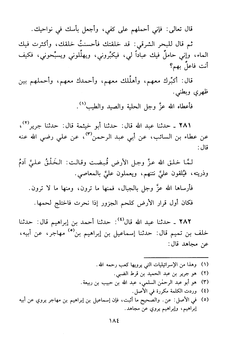 281 - حَدَّثَنَا عَبْدُ اللَّهِ قَالَ: حَدَّثَنَا أَبُو خَيْثَمَةَ، قَالَ: حَدَّثَنَا جَرِيرٌ، عَنْ عَطَاءِ بْنِ السَّائِبِ، عَنْ أَبِي عَبْدِ الرَّحْمَنِ، عَنْ عَلِيٍّ، رَضِيَ اللَّهُ عَنْهُ قَالَ: " §لَمَّا خَلَقَ اللَّهُ عَزَّ وَجَلَّ الْأَرْضَ قُبِضَتْ وَقَالَتِ: الْخَلْقُ عَلَيَّ آدَمُ وَذُرِّيَّتُهُ، فَيُلْقُونَ عَلَيَّ نَتْنَهُمْ، وَيَعْمَلُونَ عَلَيَّ بِالْمَعَاصِي. فَأَرْسَاهَا اللَّهُ عَزَّ وَجَلَّ بِالْجِبَالِ، فَمِنْهَا مَا تَرَوْنَ، وَمِنْهَا مَا لَا تَرَوْنَ. فَكَانَ أَوَّلُ قَرَارِ الْأَرْضِ كَلَحْمِ الْجَزُورِ إِذَا نُحِرَتْ فَاخْتَلَجَ لَحْمُهَا "