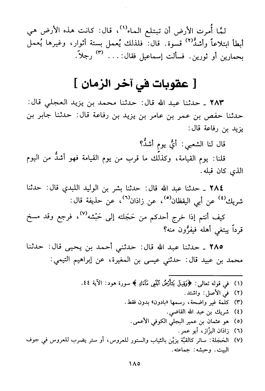 284 - حَدَّثَنَا عَبْدُ اللَّهِ قَالَ: حَدَّثَنَا بِشْرُ بْنُ الْوَلِيدِ الْكِنْدِيُّ، قَالَ: حَدَّثَنَا شَرِيكٌ، عَنْ أَبِي الْيَقْظَانِ، عَنْ زَاذَانَ، عَنْ حُذَيْفَةَ، قَالَ: «§كَيْفَ أَنْتُمْ إِذَا خَرَجَ أَحَدُكُمْ مِنْ حَجَلَتِهِ إِلَى حَبْشِهِ، فَرَجَعَ وَقَدْ مُسِخَ قِرْدًا يَبْتَغِي أَهْلَهُ فَيَفِرُّونَ مِنْهُ؟»