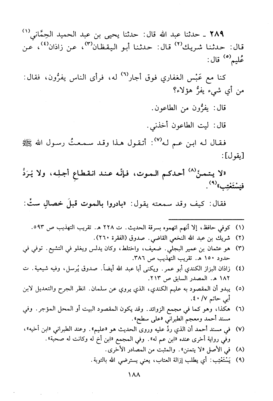 289 - حَدَّثَنَا عَبْدُ اللَّهِ قَالَ: حَدَّثَنَا يَحْيَى بْنُ عَبْدِ الْحَمِيدِ الْحِمَّانِيُّ، قَالَ: حَدَّثَنَا شَرِيكٌ، قَالَ: حَدَّثَنَا أَبُو الْيَقْظَانِ، عَنْ زَاذَانَ، عَنْ عُلَيْمٍ، قَالَ: كُنَّا مَعَ عَبْسٍ الْغِفَارِيِّ فَوْقَ أَجَارٍ لَهُ، فَرَأَى النَّاسَ يَفِرُّونَ، فَقَالَ: مِنْ أَيِّ شَيْءٍ يَفِرُّ هَؤُلَاءِ؟ قَالَ: يَفِرُّونَ مِنَ الطَّاعُونِ، قَالَ: لَيْتَ الطَّاعُونَ أَخَذَنِي، فَقَالُ لَهُ ابْنُ عَمٍّ لَهُ: أَتَقُولُ هَذَا وَقَدْ سَمِعْتُ رَسُولَ اللَّهِ صَلَّى اللَّهُ عَلَيْهِ وَسَلَّمَ يَقُولُ: «§لَا يَتَمَنَّ أَحَدُكُمُ الْمَوْتَ، فَإِنَّهُ عِنْدَ انْقِطَاعِ أَجَلِهِ، وَلَا يُرَدُّ فَيُسْتَعْتَبَ» ؟ فَقَالَ: كَيْفَ وَقَدْ سَمِعْتُهُ يَقُولُ: " بَادِرُوا بِالْمَوْتِ قَبْلَ خِصَالٍ سِتٍّ: -[189]- إِمْرَةِ السُّفَهَاءِ وَكَثْرَةِ الشُّرَطِ، وَبَيْعِ الْحُكْمِ، وَاسْتِخْفَافٍ بِالدَّمِ، وَقَطِيعَةِ الرَّحِمِ، وَنَشْوٍ يَتَّخِذُونَ الْقُرْآنَ مَزَامِيرَ يُقَدِّمُونَ الرَّجُلَ يُغَنِّيهِمْ بِالْقُرْآنِ، وَإِنْ كَانَ أَقَلَّهُمْ فِقْهًا "