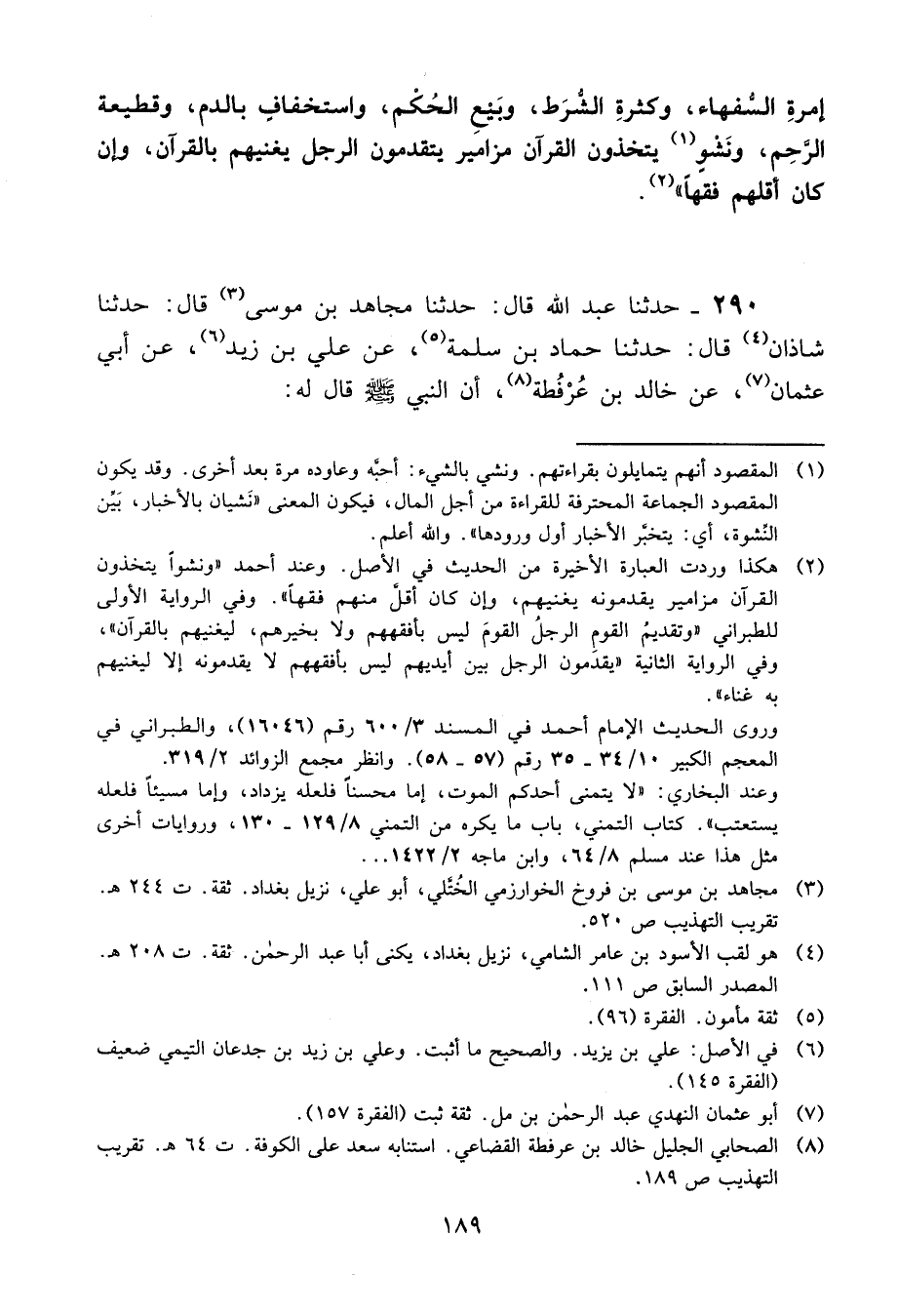 290 - حَدَّثَنَا عَبْدُ اللَّهِ قَالَ: حَدَّثَنَا مُجَاهِدُ بْنُ مُوسَى، قَالَ: حَدَّثَنَا شَاذَانُ، قَالَ: حَدَّثَنَا حَمَّادُ بْنُ سَلَمَةَ، عَنْ عَلِيِّ بْنِ زَيْدٍ، عَنْ أَبِي عُثْمَانَ، عَنْ خَالِدِ بْنِ عُرْفُطَةَ، أَنَّ النَّبِيَّ صَلَّى اللَّهُ عَلَيْهِ وَسَلَّمَ قَالَ لَهُ: -[190]- «يَا خَالِدُ، إِنَّهُ §سَيَكُونُ أَحْدَاثٌ وَاخْتِلَافٌ وَفُرْقَةٌ، فَإِذَا كَانَ كَذَلِكَ فَإِنِ اسْتَطَعْتَ أَنْ تَكُونَ الْمَقْتُولَ لَا الْقَاتِلَ»