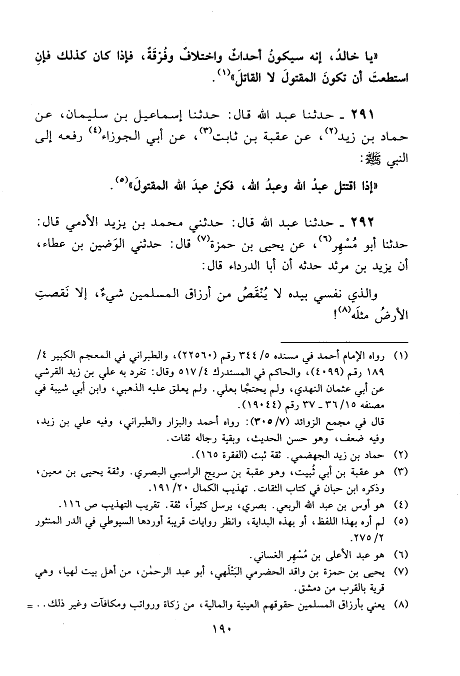291 - حَدَّثَنَا عَبْدُ اللَّهِ قَالَ: حَدَّثَنَا إِسْمَاعِيلُ بْنُ سُلَيْمَانَ، عَنْ حَمَّادِ بْنِ زَيْدٍ، عَنْ عُقْبَةَ بْنِ ثَابِتٍ، عَنْ أَبِي الْجَوْزَاءِ، رَفَعَهُ إِلَى النَّبِيِّ صَلَّى اللَّهُ عَلَيْهِ وَسَلَّمَ: «§إِذَا اقْتَتَلَ عَبْدُ اللَّهِ وَعَبْدُ اللَّهِ فَكُنْ عَبْدَ اللَّهِ الْمَقْتُولَ»