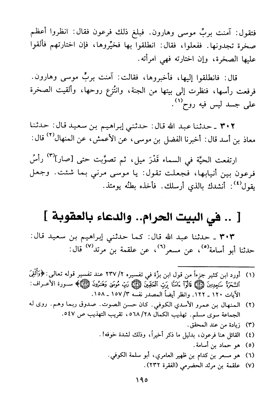 302 - حَدَّثَنَا عَبْدُ اللَّهِ قَالَ: حَدَّثَنِي إِبْرَاهِيمُ بْنُ سَعِيدٍ، قَالَ: حَدَّثَنَا مُعَاذُ بْنُ أَسَدٍ، قَالَ: أَخْبَرَنَا الْفَضْلُ بْنُ مُوسَى، عَنِ الْأَعْمَشِ، عَنِ الْمِنْهَالِ، قَالَ: " §ارْتَفَعَتِ الْحَيَّةُ فِي السَّمَاءِ قَدْرَ مِيلٍ، ثُمَّ تَصَوَّبَتْ حَتَّى صَارَ رَأْسُ فِرْعَوْنَ بَيْنَ أَنْيَابِهَا، فَجَعَلَتْ تَقُولُ: يَا مُوسَى مُرْنِي بِمَا شِئْتَ، وَجَعَلَ يَقُولُ: أَنْشُدُكِ بِالَّذِي أَرْسَلَكِ، فَأَخَذَهُ بَطْنُهُ يَوْمَئِذٍ "