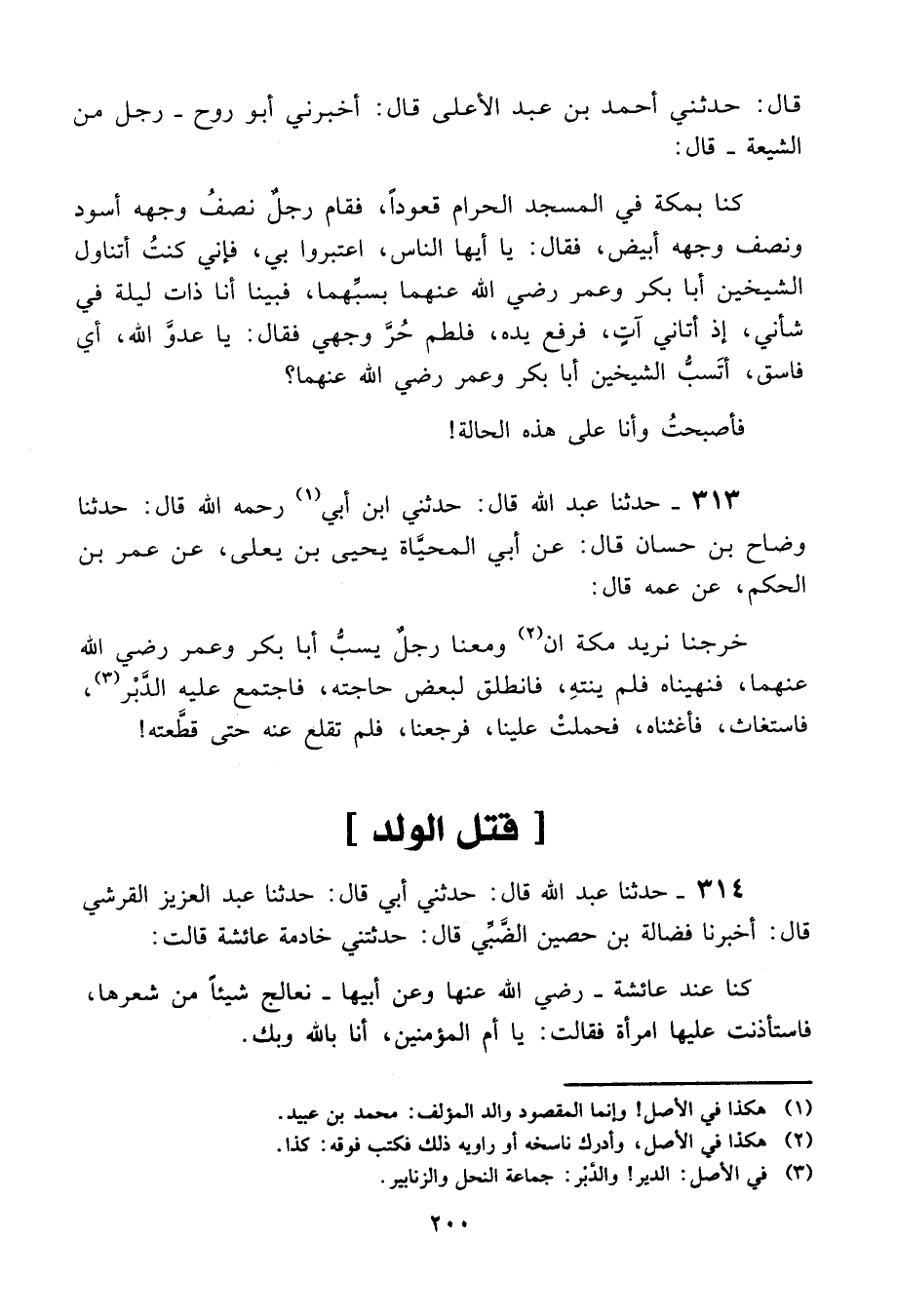 313 - حَدَّثَنَا عَبْدُ اللَّهِ قَالَ: حَدَّثَنِي أَبِي رَحِمَهُ اللَّهُ، قَالَ: حَدَّثَنَا وَضَّاحُ بْنُ حَسَّانَ، قَالَ: عَنْ أَبِي الْمُحَيَّاةِ يَحْيَى بْنِ يَعْلَى، عَنْ عُمَرَ بْنِ الْحَكَمِ، عَنْ عَمِّهِ، قَالَ: «§خَرَجْنَا نُرِيدُ مَكَّةَ وَمَعَنَا رَجُلٌ يَسُبُّ أَبَا بَكْرٍ وَعُمَرَ رَضِيَ اللَّهُ عَنْهُمَا، فَنَهَيْنَاهُ فَلَمْ يَنْتَهِ، فَانْطَلَقَ لِبَعْضِ حَاجَتِهِ، فَاجْتَمَعَ عَلَيْهِ الدَّبْرُ، فَاسْتَغَاثَ، فَأَغَثْنَاهُ، فَحَمَلَتْ عَلَيْنَا فَرَجَعْنَا، فَلَمْ تُقْلِعْ عَنْهُ حَتَّى قَطَّعَتْهُ»