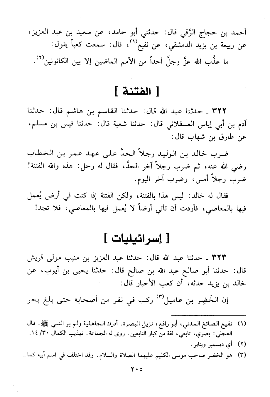 323 - حَدَّثَنَا عَبْدُ اللَّهِ قَالَ: حَدَّثَنَا عَبْدُ الْعَزِيزِ بْنُ مُنِيبٍ، مَوْلَى قُرَيْشٍ قَالَ: حَدَّثَنَا أَبُو صَالِحٍ عَبْدُ اللَّهِ بْنُ صَالِحٍ، قَالَ: حَدَّثَنَا يَحْيَى بْنُ أَيُّوبَ، عَنْ خَالِدِ بْنِ يَزِيدَ، حَدَّثَهُ، أَنَّ كَعْبَ الْأَحْبَارِ قَالَ: " إِنَّ §الْخَضِرَ بْنَ عَامِيلَ رَكِبَ فِي نَفَرٍ مِنْ أَصْحَابِهِ حَتَّى بَلَغَ بَحْرَ -[206]- الصَّرْكَنْدِ، وَهُوَ بَحْرُ الصِّينِ، فَقَالَ لِأَصْحَابِهِ: دَلُّونِي، فَدَلُّوهُ أَيَّامًا وَلَيَالِيَ، ثُمَّ صَعِدَ، فَقَالُوا لَهُ: يَا خَضِرُ، مَا رَأَيْتَ؟ فَلَقَدْ أَكْرَمَكَ اللَّهُ عَزَّ وَجَلَّ، وَحَفِظَ لَكَ نَفْسَكَ فِي لُجَجِ هَذَا الْبَحْرِ، فَقَالَ: اسْتَقْبَلَنِي مَلَكٌ مِنَ الْمَلَائِكَةِ فَقَالَ لِي: أَيُّهَا الْآدَمَيُّ الْخَطَّاءُ، إِلَى أَيْنَ؟ وَمِنْ أَيْنَ؟ فَقُلْتُ: أَرَدْتُ أَنْ أَنْظُرَ مَا عُمْقُ هَذَا الْبَحْرِ؟ قَالَ: وَكَيْفَ وَقَدْ أَهْوَى رَجُلٌ مُنْذُ زَمَنِ دَاوُدَ النَّبِيِّ عَلَيْهِ السَّلَامُ، فَلَمْ يَبْلُغْ ثُلُثَ مَقَرِّهِ حَتَّى السَّاعَةِ، وَذَلِكَ ثَلَاثُمِائَةِ سَنَةٍ؟ قَالَ: قُلْتُ: أَخْبِرْنِي عَنِ الْمَدِّ وَالْجَزْرِ، يَعْنِي زِيَادَةَ الْمَاءِ وَنُقْصَانَهُ؟ فَقَالَ الْمَلَكُ: إِنَّ الْحُوتَ يَتَنَفَّسُ، فَيَسِيرُ الْمَاءُ إِلَى مِنْخَرِهِ، فَذَلِكَ الْجَزْرُ، ثُمَّ يُخْرِجُهُ مِنْ مِنْخَرِهِ، فَذَلِكَ الْمَدُّ، قَالَ: قُلْتُ: أَخْبِرْنِي مِنْ أَيْنَ جِئْتَ؟ قَالَ: جِئْتُ مِنْ عِنْدِ الْحُوتِ، بَعَثَنِي اللَّهُ عَزَّ وَجَلَّ إِلَيْهِ أُعَذِّبُهُ؛ لِأَنَّ حِيتَانَ الْبَحْرِ شَكَتْ إِلَى اللَّهِ عَزَّ وَجَلَّ كَثْرَةَ مَا يَأْكُلُ مِنْهَا، قَالَ: قُلْتُ: أَخْبِرْنِي عَلَامَ قَرَارُ الْأَرَضِينَ؟ قَالَ: الْأَرَضُونَ السَّبْعُ عَلَى صَخْرَةٍ، وَالصَّخْرَةُ عَلَى كَفِّ مَلَكٍ، وَالْمَلَكُ عَلَى جَنَاحِ حُوتٍ فِي الْمَاءِ، وَالْمَاءُ عَلَى الرِّيحِ، وَالرِّيحُ فِي الْهَوَاءِ رِيحٌ عَقِيمٌ لَا يُلْقِحُ، وَإِنَّ قُرُونَهَا مُعَلَّقَةٌ بِالْعَرْشِ "