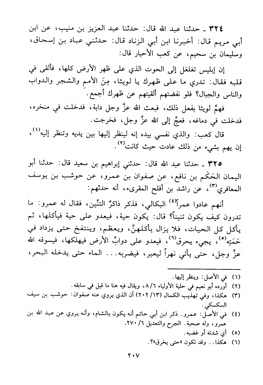 325 - حَدَّثَنَا عَبْدُ اللَّهِ قَالَ: حَدَّثَنِي إِبْرَاهِيمُ بْنُ سَعِيدٍ، قَالَ: حَدَّثَنَا أَبُو الْيَمَانِ الْحَكَمُ بْنُ نَافِعٍ، عَنْ صَفْوَانَ بْنِ عَمْرٍو، عَنْ حَوْشَبِ بْنِ يُوسُفَ الْمَعَافِرِيِّ، عَنْ رَاشِدِ بْنِ أَفْلَحَ الْمُقْرِئِ، أَنَّهُ حَدَّثَهُمْ، أَنَّهُمْ عَادُوا عَمْرًا الْبِكَالِيَّ، فَذَكَرَ ذَاكِرٌ التِّنِّينَ، فَقَالَ لَهُ عَمْرٌو: " §مَا تَدْرُونَ كَيْفَ يَكُونُ تِنِّينًا؟ قَالَ: يَكُونُ حَيَّةً، فَيَعْدُو عَلَى حَيَّةٍ فَيَأْكُلُهَا، ثُمَّ يَأْكُلُ كُلَّ الْحَيَّاتِ، فَلَا يَزَالُ يَأْكُلُهُنَّ وَيَعْظُمُ وَيَنْتَفِخُ، حَتَّى يَزْدَادَ فِي حَمَتِهِ، يَجِيءُ يَحْرِقُ، فَيَعْدُو عَلَى دَوَابِّ الْأَرْضِ فَيُهْلِكُهَا، فَيَسُوقُهُ اللَّهُ عَزَّ وَجَلَّ حَتَّى يَأْتِيَ نَهْرًا لِيَعْبُرَ، فَيَضْرِبُهُ الْمَاءُ حَتَّى يُدْخِلَهُ الْبَحْرَ، -[208]- فَيَصْنَعُ بِدَوَابِّ الْبَحْرِ كَمَا صَنَعَ بِدَوَابِّ الْبَرِّ، وَيَزْدَادُ فِي حَمَتِهِ، حَتَّى تَعِجَّ دَوَابُّ الْبَحْرِ إِلَى اللَّهِ عَزَّ وَجَلَّ، فَيَبْعَثُ اللَّهُ عَزَّ وَجَلَّ مَلَكًا، فَيَرْمِيهِ حَتَّى يُخْرِجَ رَأْسَهُ مِنَ الْمَاءِ، ثُمَّ يُدْلِي السَّحَابَ وَالْبُرُوقَ، فَيَحْمِلُهُ فَيُلْقِيهِ إِلَى يَأْجُوجَ وَمَأْجُوجَ جَزُورًا لَهُمْ، فَيَجْزُرُونَهُ كَمَا يَجْزُرُونَ الْإِبِلَ وَالْبَقَرَ "