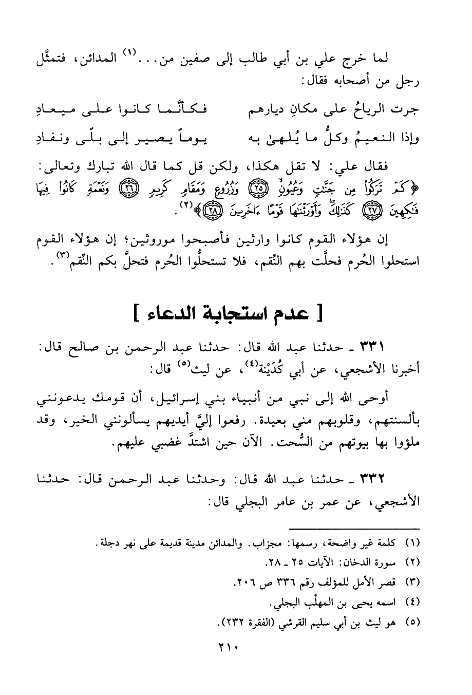 332 - حَدَّثَنَا عَبْدُ اللَّهِ قَالَ: وَحَدَّثَنَا عَبْدُ الرَّحْمَنِ، قَالَ: حَدَّثَنَا الْأَشْجَعِيُّ، عَنْ عُمَرَ بْنِ عَامِرٍ الْبَجَلِيِّ، قَالَ: -[211]- " أَوْحَى اللَّهُ إِلَى نَبِيٍّ مِنَ الْأَنْبِيَاءِ: أَنْ §مُرْ قَوْمَكَ لَا يُنَاجُونِي وَالْآثَامُ فِي أَجْفَانِهِمْ، لِيُلْقُوهَا ثُمَّ لِيَرْفَعُوا إِلَيَّ حَاجَاتِهِمْ "