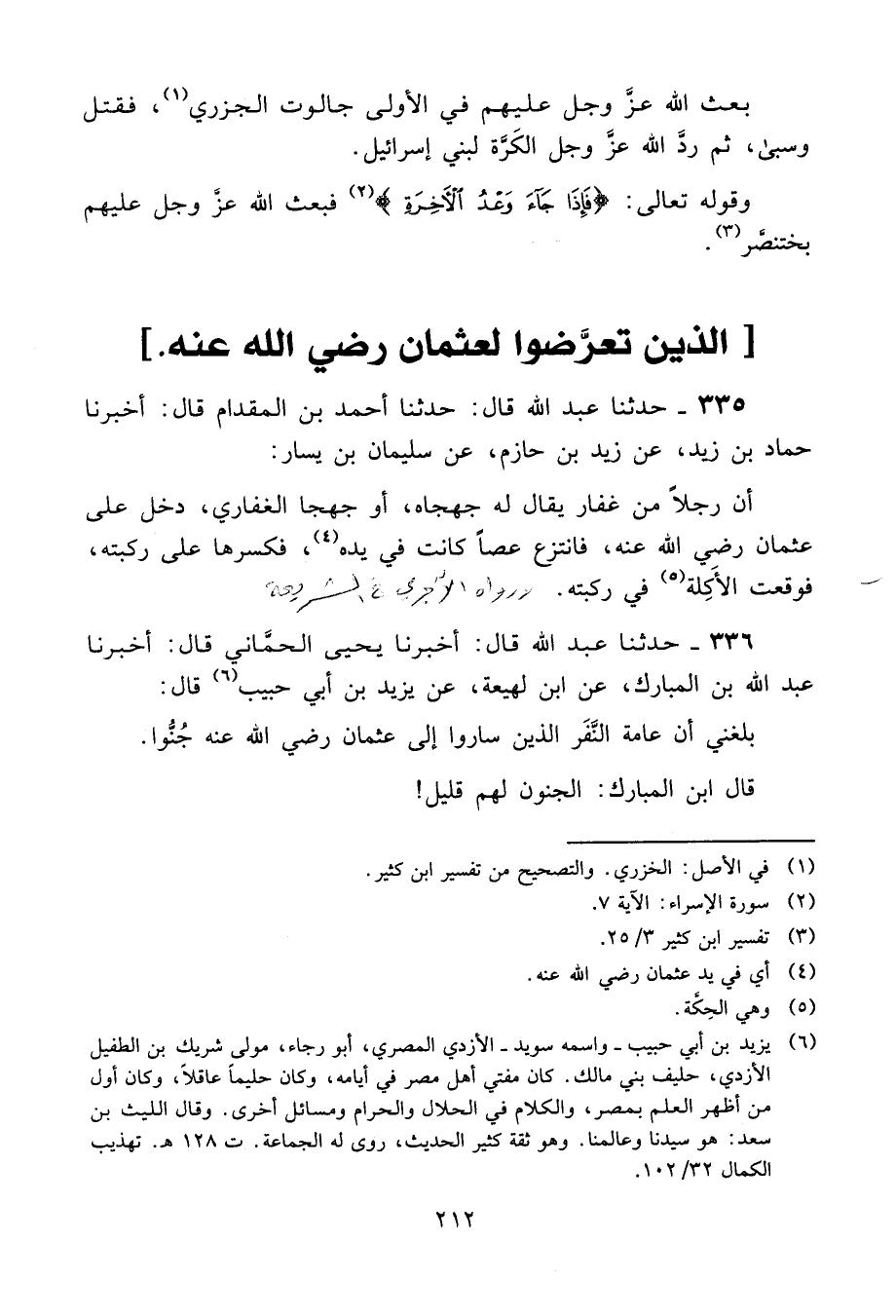 336 - حَدَّثَنَا عَبْدُ اللَّهِ قَالَ: أَخْبَرَنَا يَحْيَى الْحِمَّانِيُّ، قَالَ: أَخْبَرَنَا عَبْدُ اللَّهِ بْنُ الْمُبَارَكِ، عَنِ ابْنِ لَهِيعَةَ، عَنْ يَزِيدَ بْنِ أَبِي حَبِيبٍ، قَالَ: «بَلَغَنِي أَنَّ §عَامَّةَ النَّفَرِ، الَّذِينَ سَارُوا إِلَى عُثْمَانَ رَضِيَ اللَّهُ عَنْهُ جُنُّوا» قَالَ ابْنُ الْمُبَارَكِ: الْجُنُونُ لَهُمْ قَلِيلٌ
