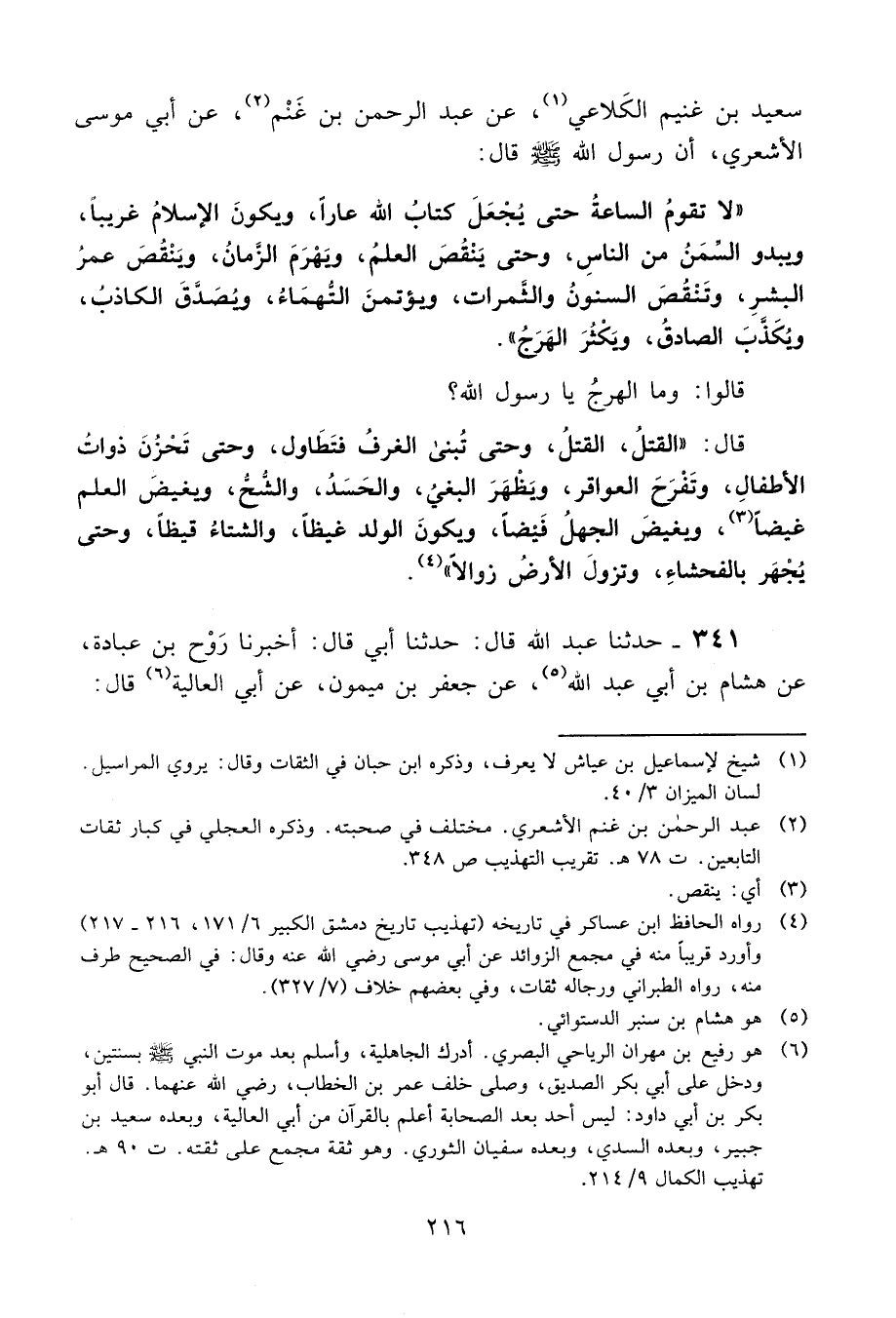 341 - حَدَّثَنَا عَبْدُ اللَّهِ قَالَ: حَدَّثَنَا أَبِي قَالَ: أَخْبَرَنَا رَوْحُ بْنُ عُبَادَةَ، عَنْ هِشَامِ بْنِ أَبِي عَبْدِ اللَّهِ، عَنْ جَعْفَرِ بْنِ مَيْمُونٍ، عَنْ أَبِي الْعَالِيَةِ، قَالَ: -[217]- " §لَيَأْتِي عَلَى النَّاسِ زَمَانٌ تَخْرَبُ صُدُورُهُمْ مِنَ الْقُرْآنِ، وَتَبْلَى كَمَا تَبْلَى ثِيَابُهُمْ، وَتَهَافَتُ لَا يَجِدُونَ لَهُ حَلَاوَةً وَلَا لَذَاذَةً، إِنْ قَصَّرُوا عَمَّا أُمِرُوا بِهِ قَالُوا: إِنَّ اللَّهَ غَفُورٌ رَحِيمٌ، وَإِنْ عَمِلُوا بِمَا نُهُوا عَنْهُ قَالُوا: سَيُغْفَرُ لَنَا، إِنَّا لَا نُشْرِكُ بِاللَّهِ شَيْئًا، أَمْرُهُمْ كُلُّهُ طَمَعٌ، لَيْسَ مَعَهُمْ خَوْفٌ، لَبِسُوا جُلُودَ الضَّأْنِ عَلَى قُلُوبِ الذِّئَابِ، أَفْضَلُهُمْ فِي أَنْفُسِهِمُ الْمُدَاهِنُ "