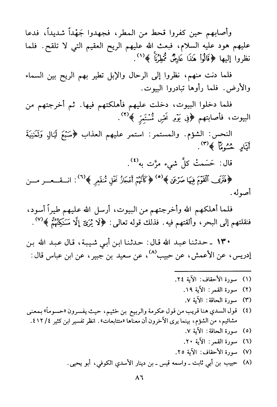 130 - حَدَّثَنَا عَبْدُ اللَّهِ قَالَ: حَدَّثَنَا ابْنُ أَبِي شَيْبَةَ، قَالَ عَبْدُ اللَّهِ بْنُ إِدْرِيسَ: عَنِ الْأَعْمَشِ، عَنْ حَبِيبٍ، عَنْ سَعِيدِ بْنِ جُبَيْرٍ، عَنِ ابْنِ عَبَّاسٍ، قَالَ: -[87]- «§لَمَّا أَرْسَلَ اللَّهُ عَزَّ وَجَلَّ عَلَى عَادٍ الرِّيحَ، جَعَلُوا يَهْرَبُونَ مِنْهَا، فَتَلَقَّتْهُمُ الْجَنَادِعُ، وَهِيَ الْحَيَّاتُ»