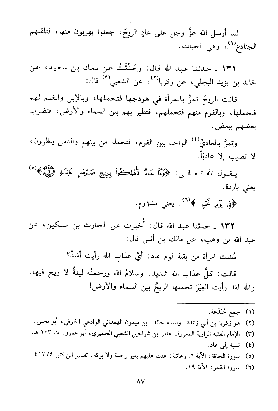131 - حَدَّثَنَا عَبْدُ اللَّهِ قَالَ: وَحُدِّثْتُ عَنْ يَمَانِ بْنِ سَعِيدٍ، عَنْ خَالِدِ بْنِ يَزِيدَ الْبَجَلِيِّ، عَنْ زَكَرِيَّا، عَنِ الشَّعْبِيِّ، قَالَ: " كَانَتِ الرِّيحُ تَمُرُّ بِالْمَرْأَةِ فِي هَوْدَجِهَا فَتَحْمِلُهَا، وَبِالْإِبِلِ وَالْغَنَمِ لَهُمْ فَتَحْمِلُهَا، وَبِالْقَومِ مِنْهُمْ §فَتَحْمِلُهُمْ، فَتَطِيرُ بِهِمْ بَيْنَ السَّمَاءِ وَالْأَرْضِ، فَتَضْرِبُ بَعْضَهُمْ بِبَعْضٍ. وَتَمُرُّ بِالْعَادِيِّ الْوَاحِدِ بَيْنَ الْقَوْمِ، فَتَحْمِلُهُ مِنْ بَيْنِهِمْ وَالنَّاسُ يَنْظُرُونَ، لَا تُصِيبُ إِلَّا عَادِيًّا. يَقُولُ اللَّهُ تَعَالَى: {وَأَمَّا عَادٌ فَأُهْلِكُوا بِرِيحٍ صَرْصَرٍ عَاتِيَةٍ} [الحاقة: 6] ، يَعْنِي بَارِدَةً. {فِي يَوْمِ نَحْسٍ} [القمر: 19] : يَعْنِي: مَشْؤُومٌ "