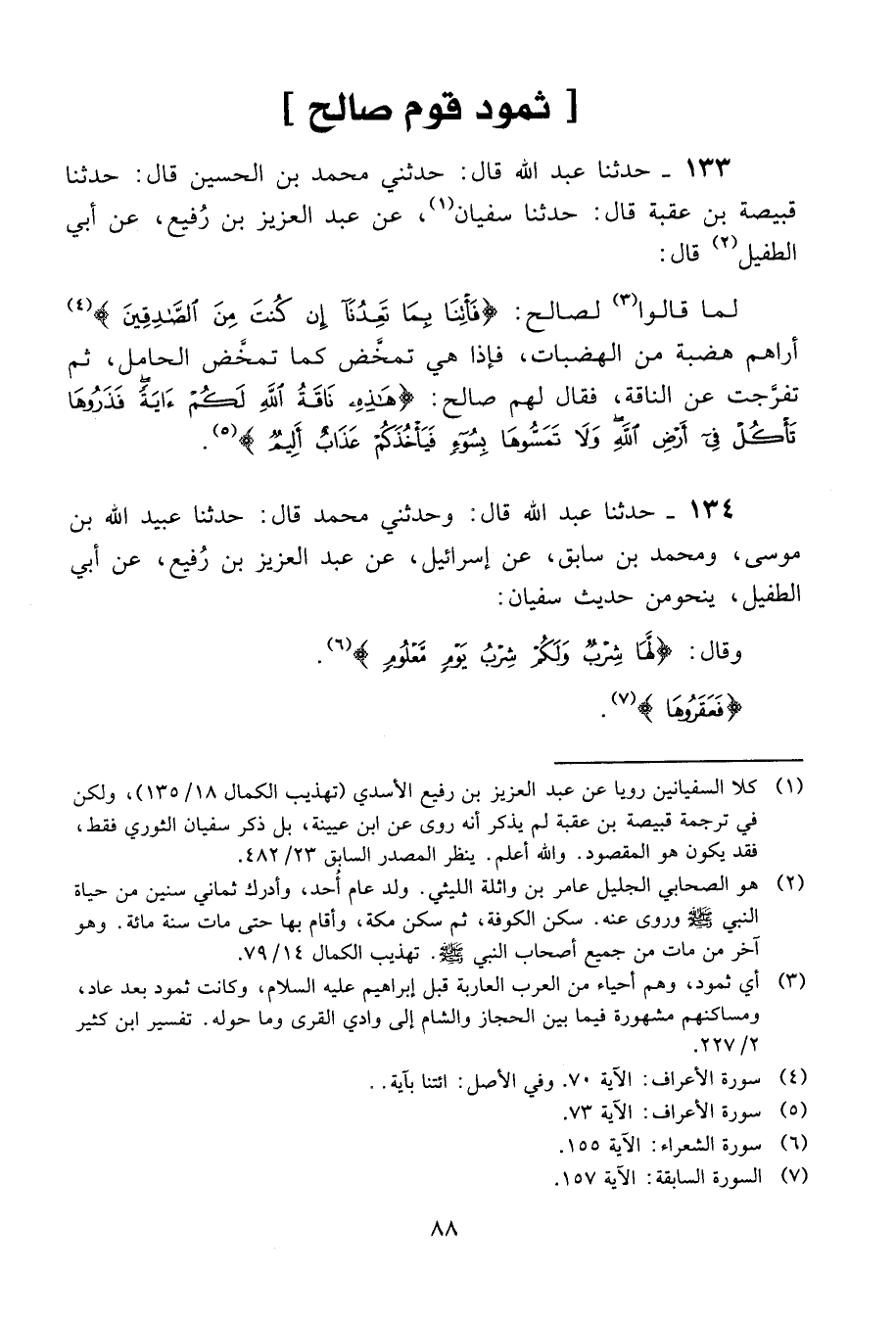 133 - حَدَّثَنَا عَبْدُ اللَّهِ قَالَ: حَدَّثَنِي مُحَمَّدُ بْنُ الْحُسَيْنِ، قَالَ: حَدَّثَنَا قَبِيصَةُ بْنُ عُقْبَةَ، قَالَ: حَدَّثَنَا سُفْيَانُ، عَنْ عَبْدِ الْعَزِيزِ بْنِ رُفَيْعٍ، عَنْ أَبِي الطُّفَيْلِ، قَالَ: " لَمَّا قَالُوا لِصَالِحٍ: {ائْتِنَا بِمَا تَعِدُنَا إِنْ كُنْتَ مِنَ الْمُرْسَلِينَ} [الأعراف: 77] §أَرَاهُمْ هَضْبَةً مِنَ الْهَضَبَاتِ، فَإِذَا هِيَ تَمَخَّضُ كَمَا تَمَخَّضُ الْحَامِلُ، ثُمَّ تَفَرَّجَتْ عَنِ النَّاقَةِ، فَقَالَ لَهُمْ صَالِحٌ: {هَذِهِ نَاقَةُ اللَّهِ لَكُمْ آيَةً فَذَرُوهَا تَأْكُلْ فِي أَرْضِ اللَّهِ وَلَا تَمَسُّوهَا بِسُوءٍ فَيَأْخُذَكُمْ عَذَابٌ أَلِيمٌ} [الأعراف: 73] "