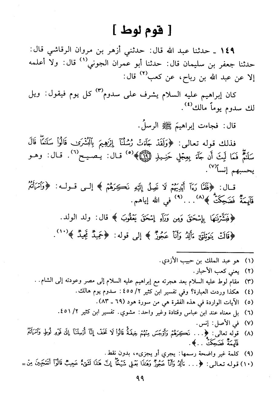 149 - حَدَّثَنَا عَبْدُ اللَّهِ قَالَ: حَدَّثَنِي أَزْهَرُ بْنُ مَرْوَانَ الرَّقَاشِيُّ، قَالَ: حَدَّثَنَا جَعْفَرُ بْنُ سُلَيْمَانَ، قَالَ: حَدَّثَنَا أَبُو عِمْرَانَ الْجَوْنِيُّ، قَالَ: وَلَا أَعْلَمُهُ إِلَّا عَنْ عَبْدِ اللَّهِ بْنِ رَبَاحٍ، عَنْ كَعْبٍ، قَالَ: " §كَانَ إِبْرَاهِيمُ عَلَيْهِ السَّلَامُ يُشْرِفُ عَلَى سَدْومَ كُلَّ يَوْمٍ فَيَقُولُ: وَيْلٌ لَكِ سَدْومُ يَوْمَ هَالَكٍ، قَالَ: فَجَاءَتْ إِبْرَاهِيمَ صَلَّى اللَّهُ عَلَيْهِ وَسَلَّمَ الرُّسُلُ. فَذَلِكَ قَوْلُهُ تَعَالَى: {وَلَقَدْ جَاءَتْ رُسُلُنَا إِبْرَاهِيمَ بِالْبُشْرَى قَالُوا سَلَامًا قَالَ سَلَامٌ فَمَا لَبِثَ أَنْ جَاءَ بِعِجْلٍ حَنِيذٍ} [هود: 69] قَالَ: يَصِيحُ، قَالَ: وَهُوَ يَحْسَبُهُمْ إِنْسًا، قَالَ: {فَلَمَّا رَأَى أَيْدِيَهُمْ لَا تَصِلُ إِلَيْهِ نَكِرَهُمْ} [هود: 70] إِلَى قَوْلِهِ: {وَامْرَأَتُهُ قَائِمَةٌ فَضَحِكَتْ} [هود: 71] . . . فِي اللَّهِ إِيَّاهُمْ. {فَبَشَّرْنَاهَا بِإِسْحَاقَ وَمِنْ وَرَاءِ إِسْحَاقَ يَعْقُوبَ} ، قَالَ: وَلَدُ الْوَلَدِ، قَالَتْ: {يَا وَيْلَتَى أَأَلِدُ وَأَنَا عَجُوزٌ} [هود: 72] إِلَى قَوْلِهِ: {حَمِيدٌ مَجِيدٌ} [هود: 73]-[100]- قَالَ: فَكَلَّمَهُمْ إِبْرَاهِيمَ فِي قَوْمِ لُوطٍ، قَالُوا: {يَا إِبْرَاهِيمُ أَعْرِضْ عَنْ هَذَا} [هود: 76] ، {وَلَمَّا جَاءَتْ رُسُلُنَا لُوطًا سِيءَ بِهِمْ} [هود: 77] قَالَ: فَسَاءَهُ مَكَانُهُمْ، {وَضَاقَ بِهِمْ ذَرْعًا وَقَالَ هَذَا يَوْمٌ عَصَيبٌ} [هود: 77] : هَذَا يَوْمٌ سَيِّئٌ لِي مِنْ قَوْمِي. قَالَ: فَذَهَبَ بِهِمْ إِلَى مَنْزِلِهِ. قَالَ: فَدَخَنَتِ امْرَأَتُهُ، {وَجَاءَهُ قَوْمُهُ يُهْرَعُونَ إِلَيْهِ} [هود: 78] ، {قَالَ يَا قَوْمِ هَؤُلَاءِ بَنَاتِي هُنَّ أَطْهَرُ لَكُمْ} [هود: 78] تَزَوَّجُوهُنَّ، {أَلَيْسَ مِنْكُمْ رَجُلٌ رَشِيدٌ} [هود: 78] ؟ إِلَى قَوْلِهِ: {وَإِنَّكَ لَتَعْلَمُ مَا نُرِيدُ} [هود: 79] " قَالَ أَبُو عِمْرَانَ: وَجَعَلَ لُوطٌ الْأَضْيَافَ فِي بَيْتِهِ، وَقَعَدَ عَلَى بَابِ الْبَيْتِ وَقَالَ: {لَوْ أَنَّ لِي بِكُمْ قُوَّةً أَوْ آوِي إِلَى رُكْنٍ شَدِيدٍ} [هود: 80] ، قَالَ: عَشِيرَةٌ تَمْنَعُنِي. قَالَ أَبُو عِمْرَانَ: فَبَلَغَنِي أَنَّهُ لَمْ يَبْعَثِ اللَّهُ نَبِيًّا بَعْدَ لُوطٍ إِلَّا فِي عِزٍّ مِنْ قَوْمِهِ، قَالَ: فَلَمَّا رَأَتِ الرُّسُلُ مَا قَدْ لَقِيَ لُوطٌ بِسَبَبِهِمْ {قَالُوا يَا لُوطُ إِنَّا رُسُلُ رَبِّكَ لَنْ يَصِلُوا إِلَيْكَ فَأَسْرِ بِأَهْلِكَ بِقِطْعٍ مِنَ اللَّيْلِ} [هود: 81] إِلَى قَوْلِهِ: {بِقَرِيبٍ} [هود: 81] ، -[101]- فَخَرَجَ عَلَيْهِمْ جِبْرِيلُ صَلَّى اللَّهُ عَلَيْهِ وَسَلَّمَ، فَضَرَبَ وُجُوهَهُمْ بِجَنَاحِهِ ضَرْبًا طَمَسَ أَعْيُنَهُمْ، قَالَ: وَالطَّمْسُ أَنْ تَذْهَبَ الْعَيْنُ حَتَّى تَسْتَوِيَ. قَالَ: وَاحْتَمَلَ جِبْرِيلُ مَدَائِنَهُمْ، أَوْ كَلِمَةً نَحْوَهَا، حَتَّى سَمِعَ أَهْلُ سَمَاءِ الدُّنْيَا نُبَاحَ كِلَابِهِمْ وَأَصْوَاتَ دُيُوكِهِمْ، ثُمَّ قَلَبَهَا عَلَيْهِمْ. {وَأَمْطَرْنَا عَلَيْهَا حِجَارَةً مِنْ سِجِّيلٍ} [هود: 82] قَالَ: عَلَى أَهْلِ بَوَادِيهِمْ، وَعَلَى رِعَائِهِمْ، وَعَلَى مُسَافِرِيهِمْ، فَلَمْ يَنْفَلِتْ مِنْهُمْ إِنْسَانٌ