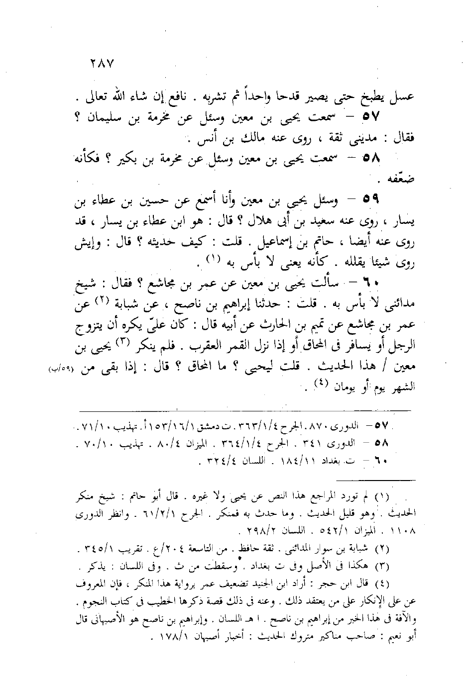 (59) وسئل يحيى بن معين وأنا أسمع عن حسين بن عطاء بن يسار، روى عنه سعيد بن أبي هلال، قال: «هو ابن عطاء بن يسار، قد روى عنه أيضاً حاتم بن إسماعيل» قلت: كيف حديثه؟ قال: «وأيش روى شيئاً» يقلله، كأنه يعني: لا بأس به.