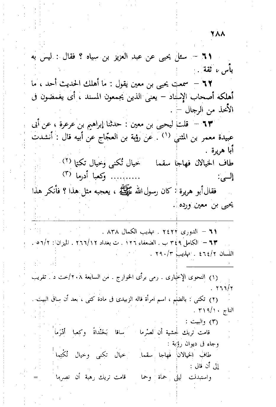 (63) قلت ليحيى بن معين: حدثنا إبراهيم بن عرعرة، عن أبي عبيدة معمر بن المثنى، عن رؤبة بن العجاج، عن أبيه قال: أنشدت أبا هريرة: