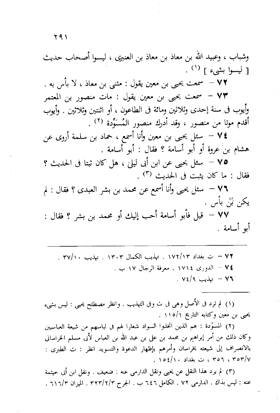 (73) سمعت يحيى بن معين يقول: «مات منصور بن المعتمر وأيوب في سنة إحدى وثلاثين ومائة في الطاعون، أو اثنتين وثلاثثين، وأيوب أقدم موتاً من منصور، وقد أدرك منصور المُسَوِّدة» .