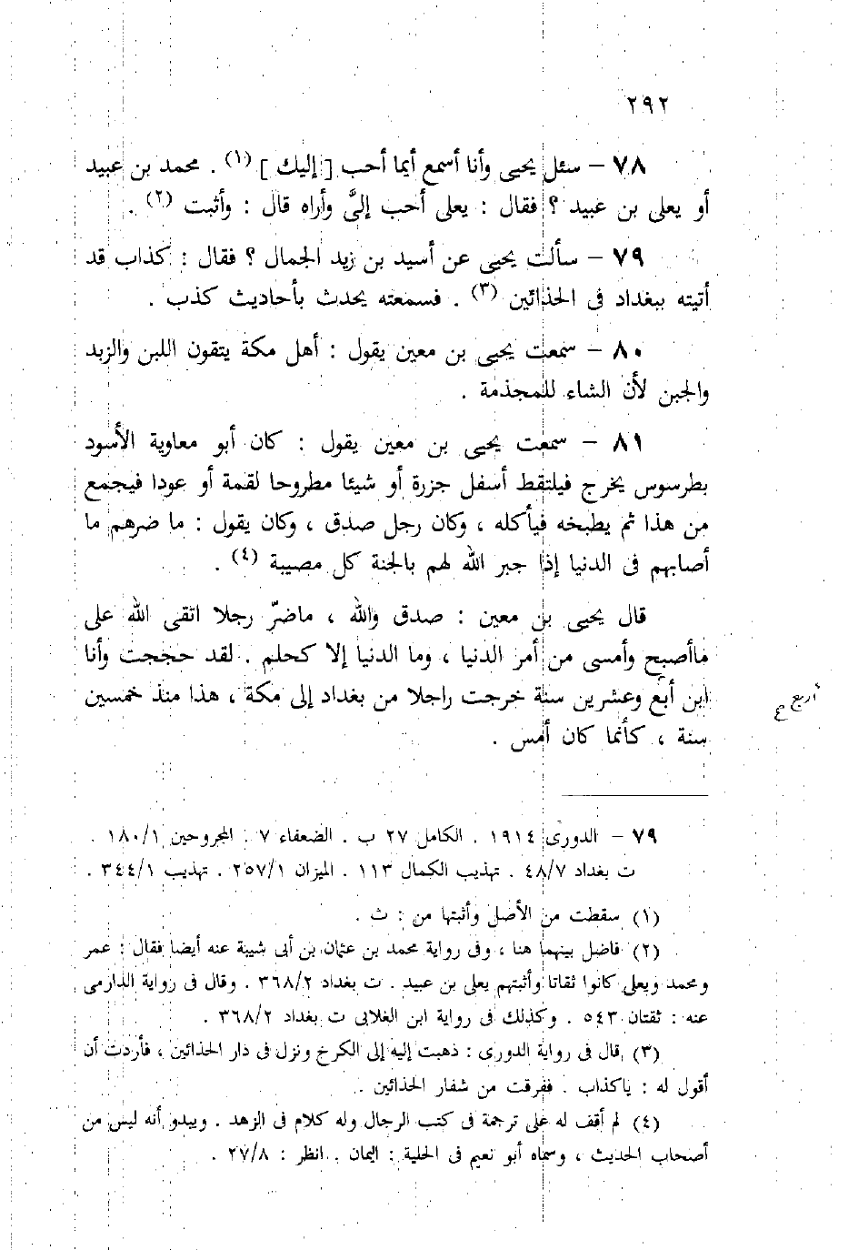 (81) سمعت يحيى بن معين يقول: «كان أبو معاوية الأسود بطرسوس يخرج فيلتقط أسفل جزرة أو شيئاً مطروحاً لقمة أو عوداً، فيجمع من هذا ثم يطبخه فيأكله، وكان رجل صدق، وكان يقول: (ما ضرهم ما أصابهم في الدنيا إذا جبر الله لهم بالجنة كل مصيبة) » . قال يحيى بن معين: «صدق والله، ما ضر رجلاً اتقى الله على ما أصبح وأمسى من أمر الدنيا، وما الدنيا إلا كحلم، لقد حججت وأنا ابن أربع وعشرين سنة، خرجت راجلاً من بغداد إلى مكة، هذا منذ خمسين سنة، كأنما كان أمس» .