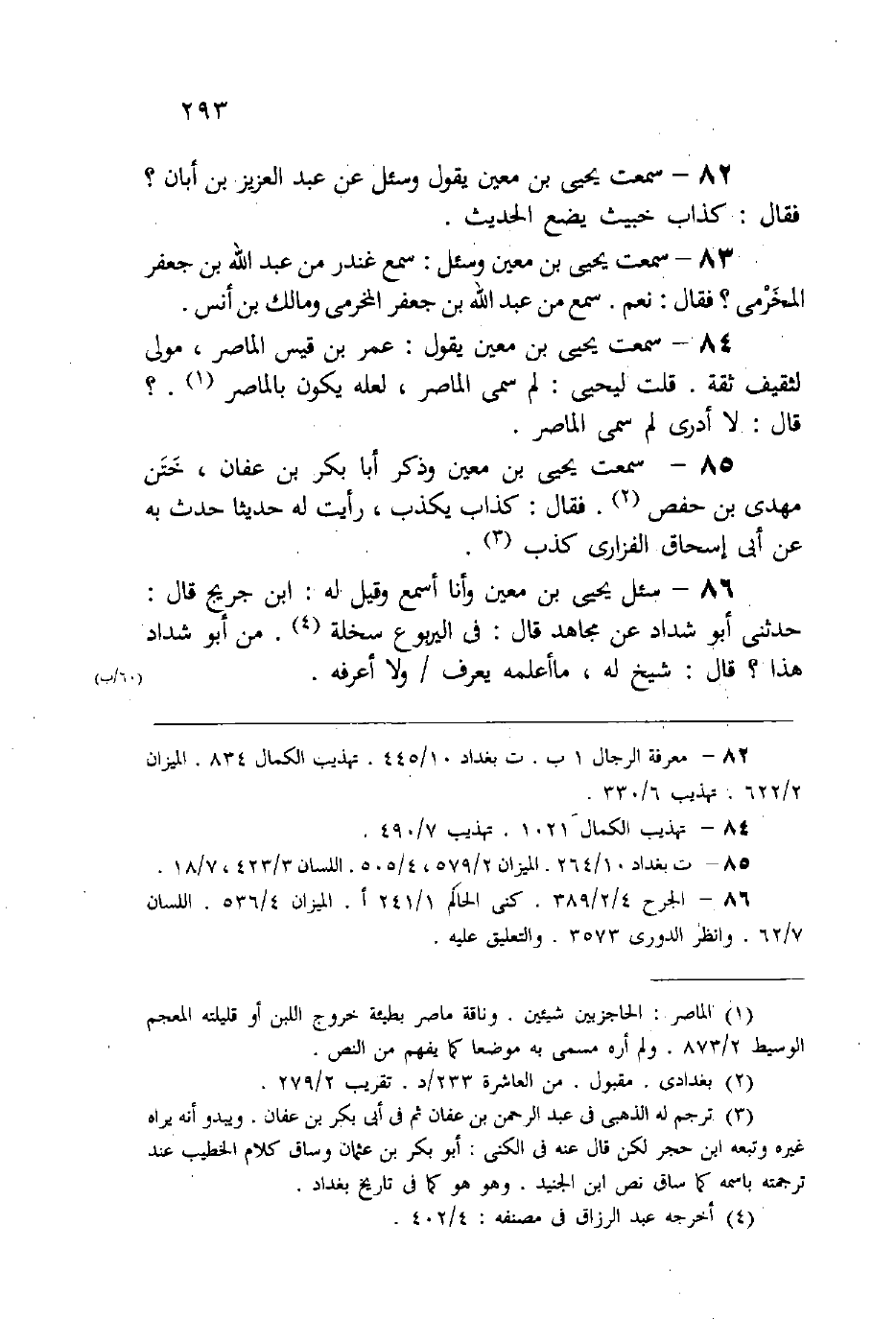 (84) سمعت يحيى بن معين يقول: «عمر بن قيس الماصر مولى لثقيف، ثقة» ، قلت ليحيى: لم سمي الماصر، لعله كان يكون بالماصر؟ قال: «لا أدري لم سمي الماصر» .