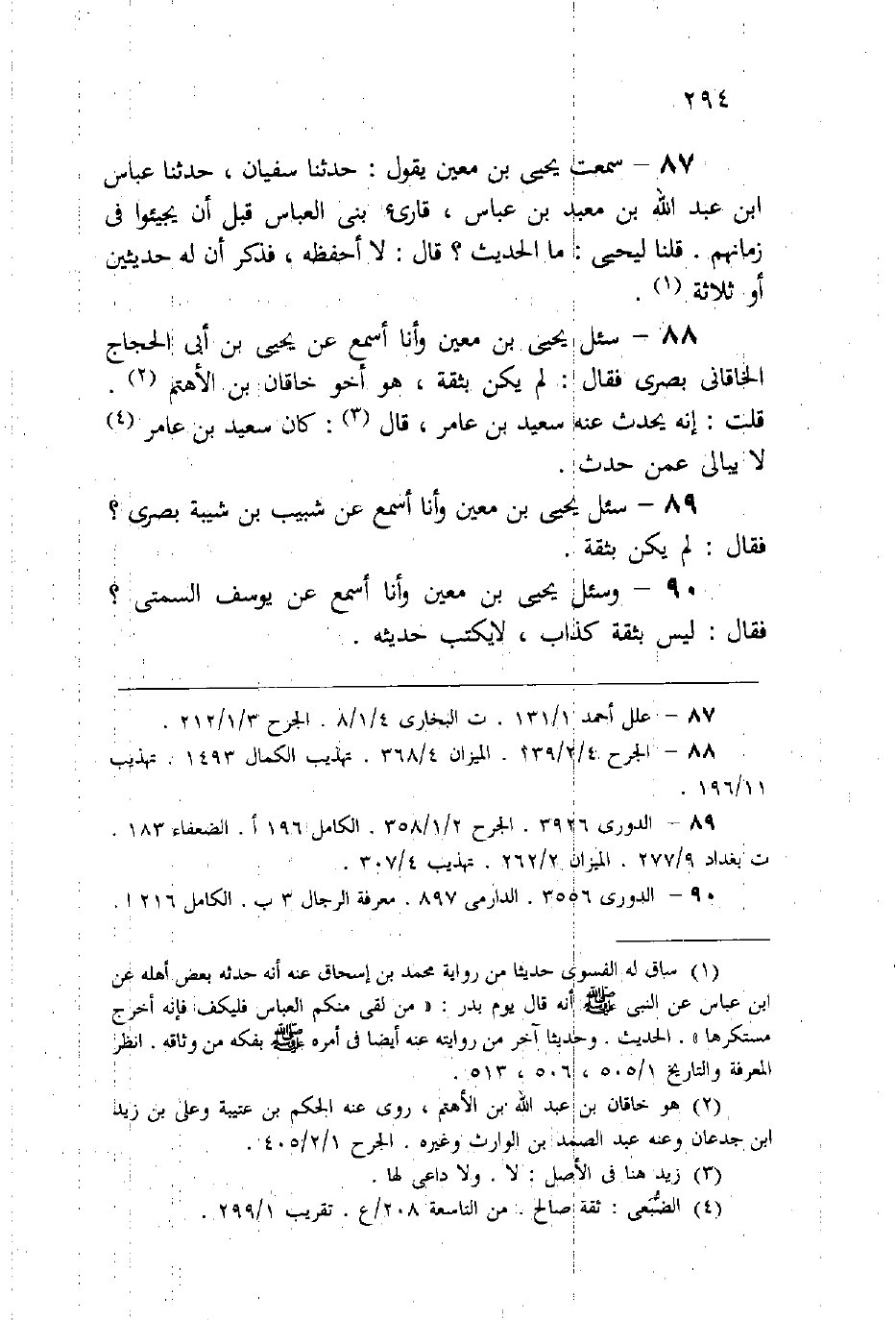 (88) سئل يحيى بن معين وأنا أسمع عن يحيى بن أبي الحجاج الخاقاني بصري، فقال: «لم يكن بثقة، هو أخو خاقان بن الأهتم» ، قلت: إنه يحدث عنه سعيد بن عامر، قال: «كان سعيد بن عامر لا يبالي عمن حدث» .