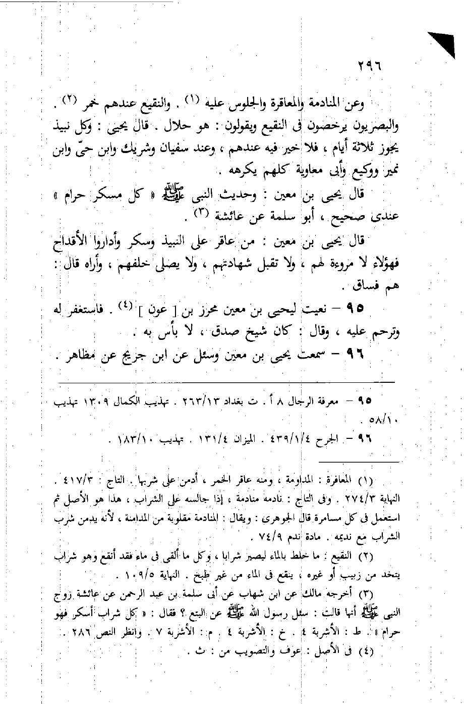 وعن المنادمة والمعاقرة والجلوس عليه، والنقيع عندهم خمر، والبصريون يرخصون في النقيع، ويقولون: هو حلال» ، قال يحيى: «وكل نبيذ يجوز ثلاثة أيام فلا خير فيه عندهم، وعند سفيان وشريك وابن حي وابن نمير ووكيع وأبي معاوية، كلهم يكرهه» . قال يحيى بن معين: «وحديث النبي -صلى الله عليه وسلم-: (كل مسكر حرام) عندي صحيح، أبو سلمة عن عائشة» . قال يحيى بن معين: «من عاقر على النبيذ وسكر وأداروا الأقداح، فهؤلاء لا مروءة لهم، ولا تقبل شهادتهم، ولا يصلى خلفهم» ، وأراه قال: «هم فُسَّاق» .