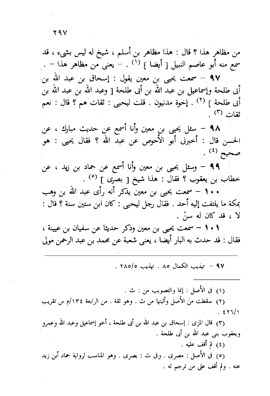 (97) سمعت يحيى بن معين يقول: «إسحاق بن عبد الله بن أبي طلحة، وإسماعيل بن عبد الله بن أبي طلحة، وعبد الله بن عبد الله بن أبي طلحة إخوة مدنيون» ، قلت ليحيى: ثقات هم؟ قال: «نعم، ثقات» .