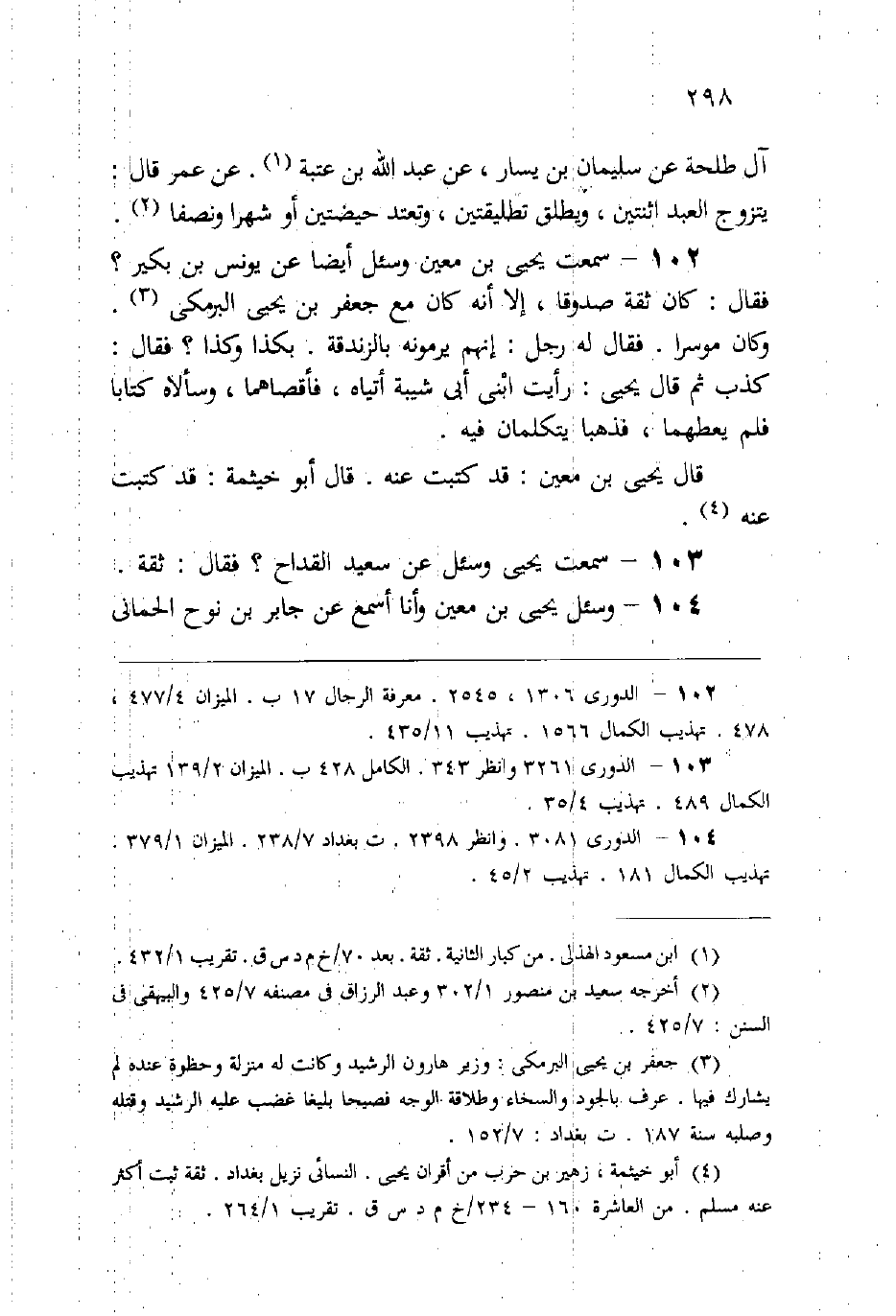 (102) سمعت يحيى بن معين وسئل أيضاً عن يونس بن بكير، فقال: «كان ثقة صدوقاً، إلا أنه كان مع جعفر بن يحيى البرمكي، وكان موسراً» ، فقال له رجل: إنهم يرمونه بالزندقة بكذا وكذا، فقال: «كذب» ، ثم قال يحيى: «رأيت ابني أبي شيبة أتياه، فأقصاهما، وسألاه كتاباً، فلم يعطهما؛ فذهبا يتكلمان فيه» . قال يحيى بن معين: «قد كتبت عنه» ، قال أبو خيثمة: «قد كتبت عنه» .