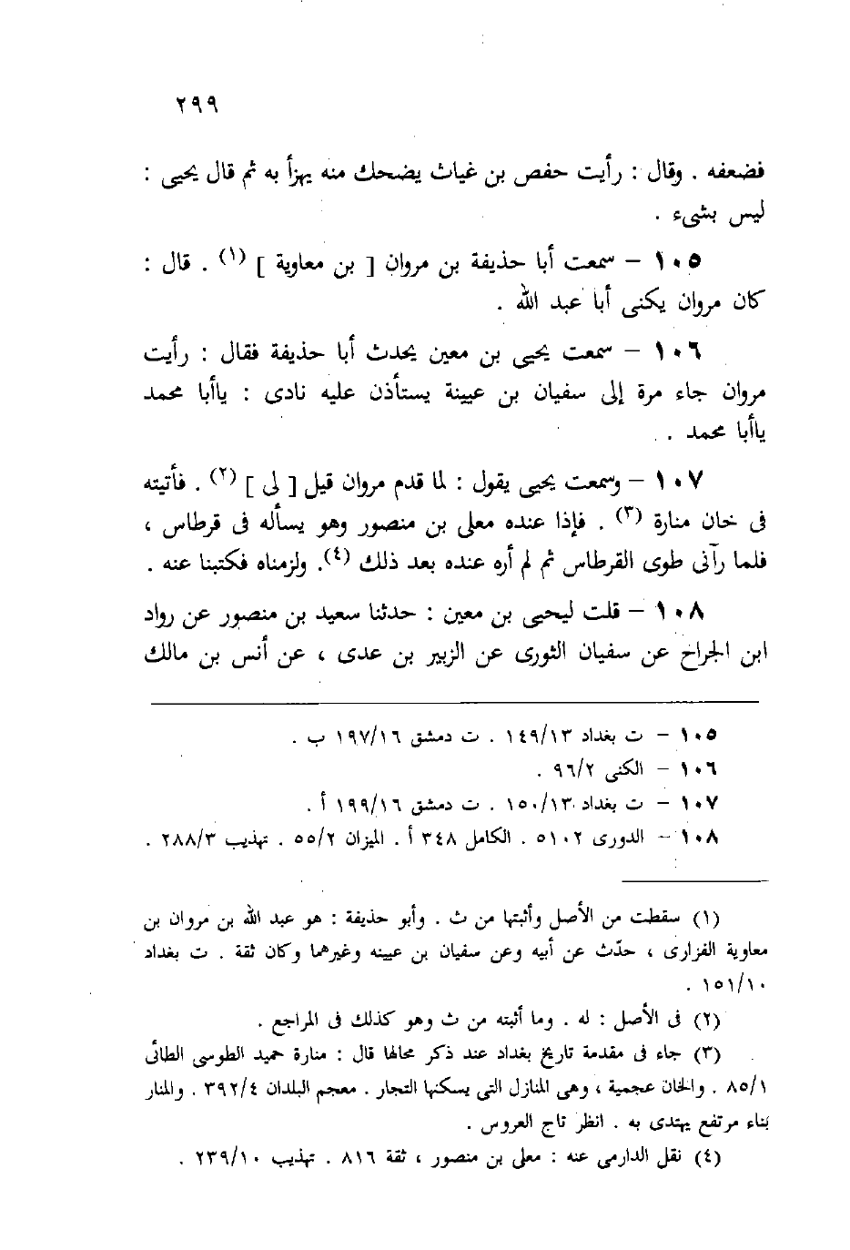 (107) وسمعت يحيى يقول: «لما قدم مروان قيل لي، فأتيته في خان منارة، فإذا عنده معلى بن منصور وهو يسأله في قرطاس، فلما رآني طوى القرطاس، ثم لم أره عنده بعد ذلك، ولزمناه فكتبنا عنه» .