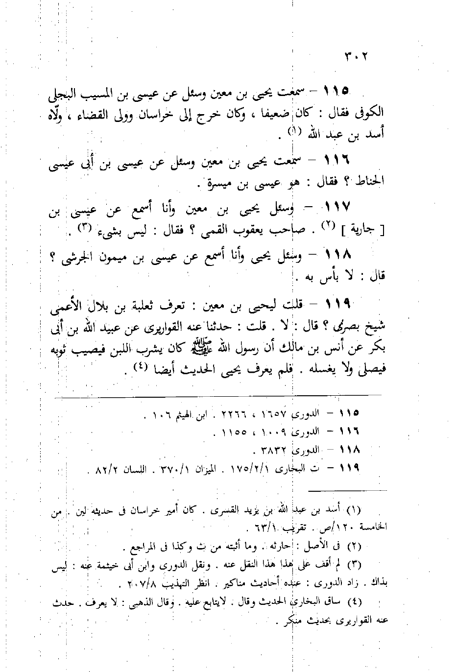 (119) قلت ليحيى بن معين: تعرف ثعلبة بن بلال الأعمى شيخ بصري؟ قال: «لا» ، قلت: حدثنا عنه القواريري، عن عبيد الله بن أبي بكر، عن أنس بن مالك أن رسول الله -صلى الله عليه وسلم- كان يشرب اللبن فيصيب ثوبه، فيصلي ولا يغسله. فلم يعرف يحيى الحديث أيضاً.