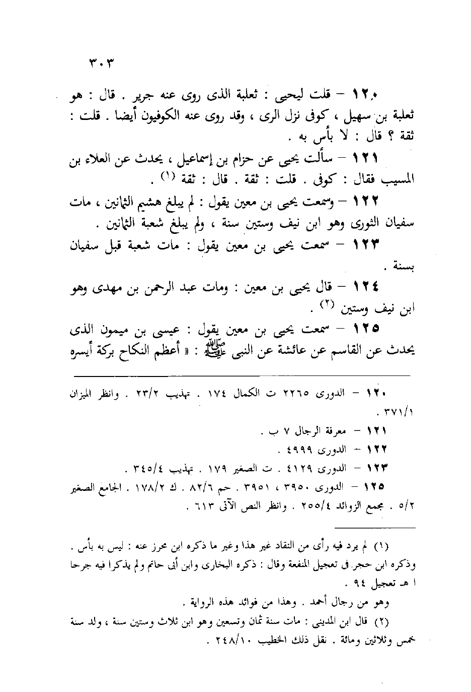 (120) قلت ليحيى: ثعلبة الذي روى عنه جرير، قال: «هو ثعلبة بن سهيل، كوفي نزل الري، وقد روى عنه الكوفيون أيضاً» ، قلت: ثقة؟ قال: «لا بأس به» .