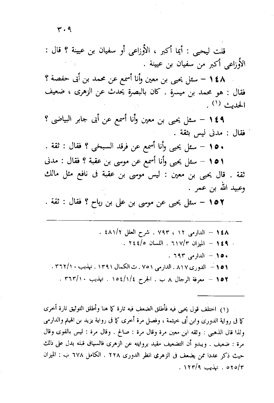 (151) سئل يحيى وأنا أسمع عن موسى بن عقبة، فقال: «مدني، ثقة» . قال يحيى بن معين: «ليس موسى بن عقبة في نافع مثل مالك وعبيد الله بن عمر» .