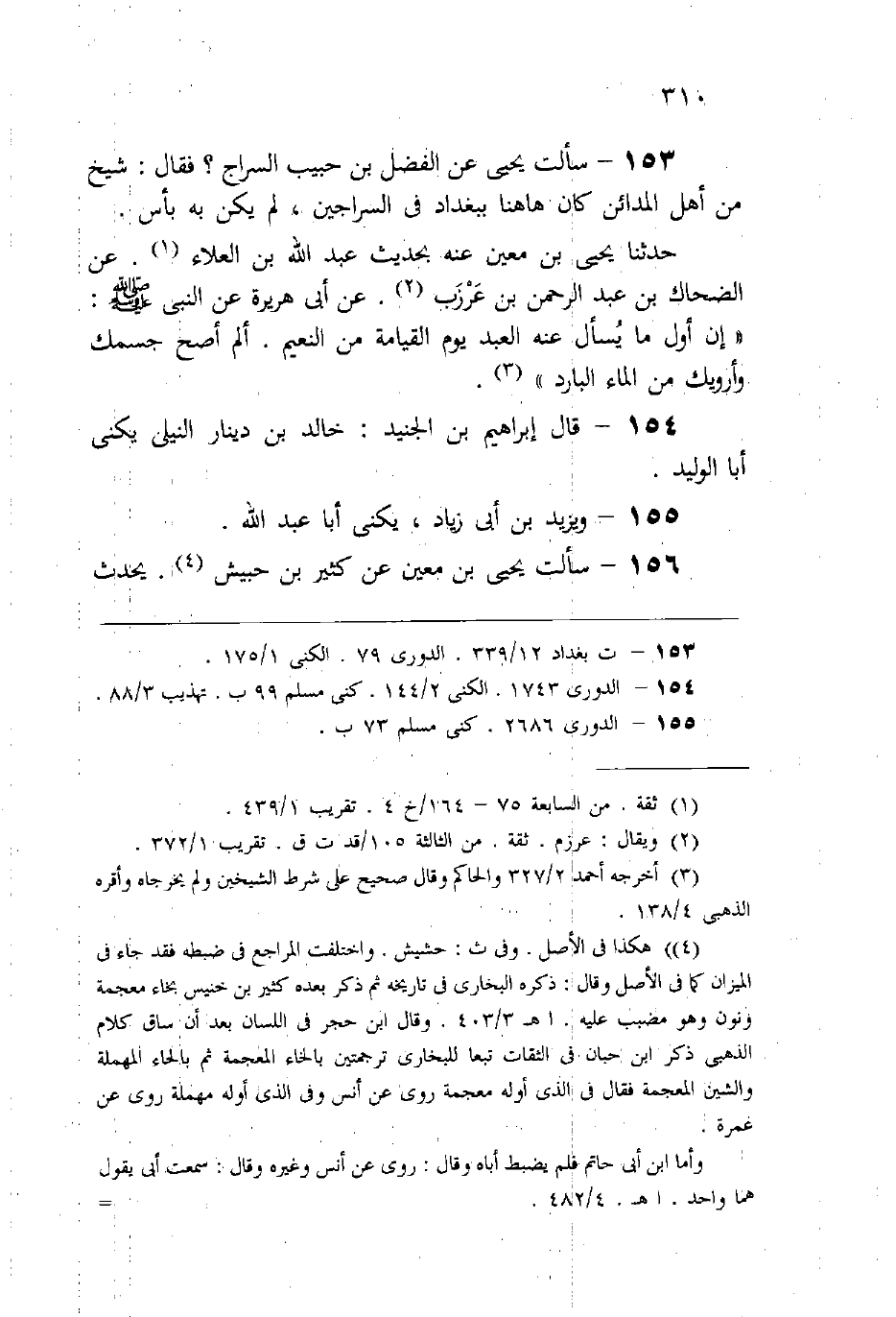 (153) سألت يحيى عن الفضل بن حبيب السراج، فقال: «شيخ من أهل المدائن، كان هاهنا ببغداد في السراجين، لم يكن به بأس» . حدثنا يحيى بن معين عنه بحديث عبد الله بن العلاء، عن الضحاك بن عبد الرحمن بن عرزب، عن أبي هريرة، عن النبي -صلى الله عليه وسلم-: «إن أول ما يسأل عنه العبد يوم القيامة من النعيم: ألم أصح جسمك، وأرويك من الماء البارد» .
