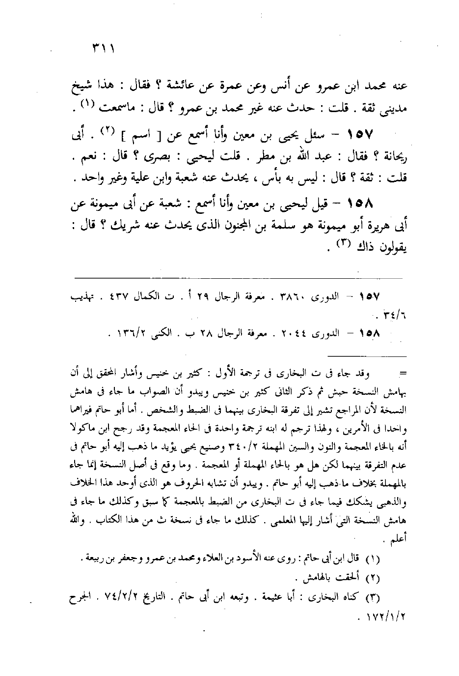 (157) سئل يحيى بن معين وأنا أسمع عن اسم أبي ريحانة، فقال: «عبد الله بن مطر» ، قلت ليحيى: بصري؟ قال: «نعم» ، قلت: ثقة؟ قال: «ليس به بأس، يحدث عنه شعبة وابن علية وغير واحد» .