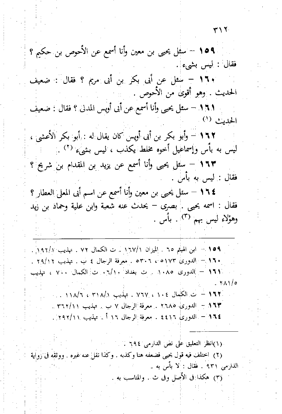 (159) سئل يحيى بن معين وأنا أسمع عن الأحوص بن حكيم، فقال: «ليس بشيء» .