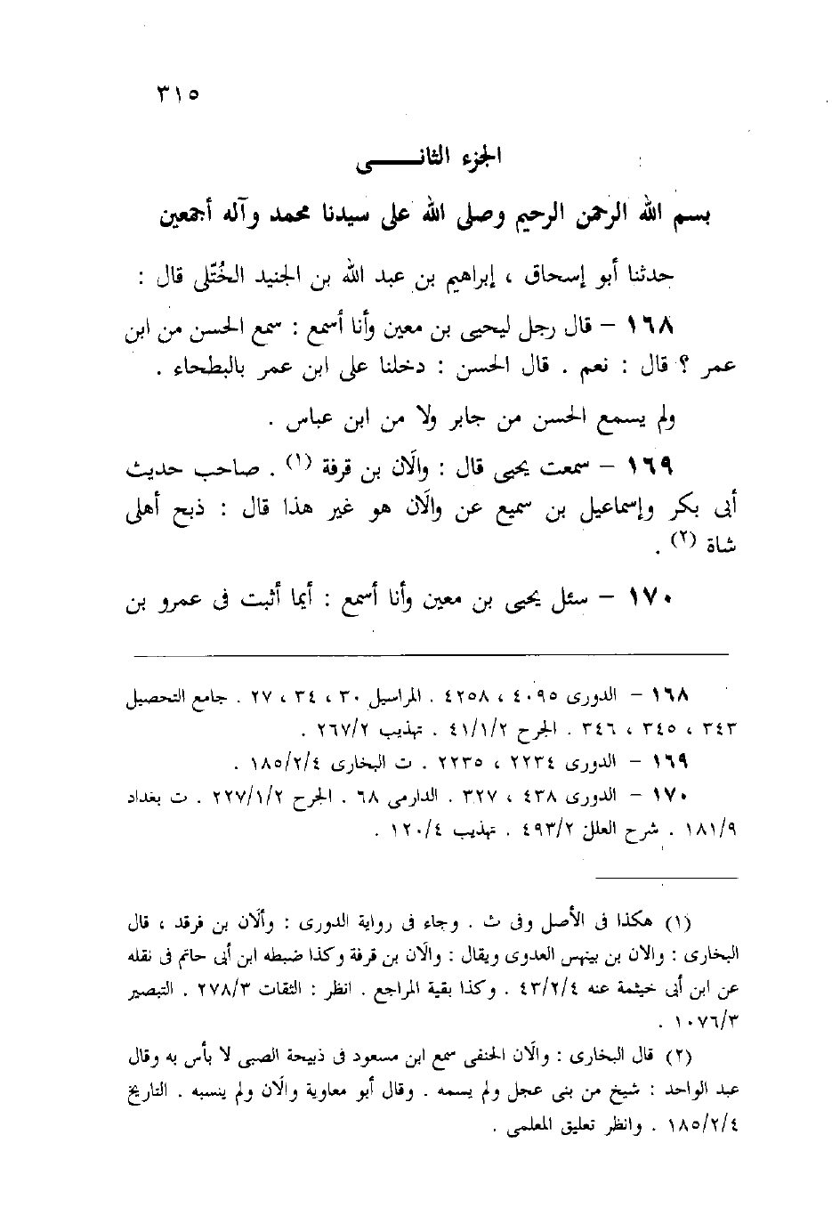 (168) قال رجل ليحيى بن معين وأنا أسمع: سمع الحسن من ابن عمر؟ قال: «نعم، قال الحسن: (دخلنا على ابن عمر بالبطحاء) ، ولم يسمع الحسن من جابر ولا من ابن عباس» .