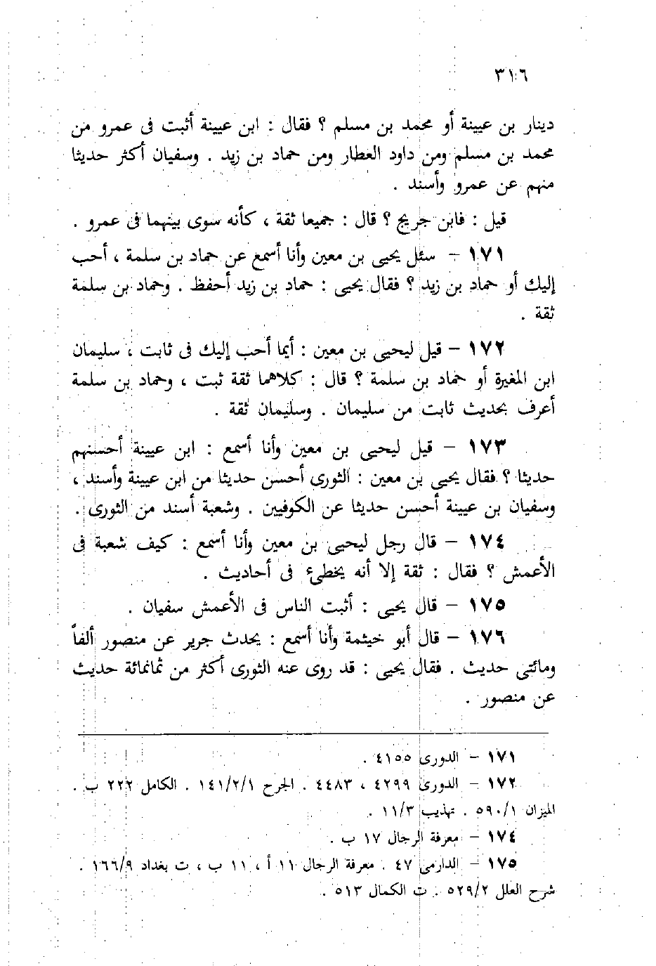 (173) قيل ليحيى بن معين وأنا أسمع: ابن عيينة أحسنهم حديثاً؟ فقال يحيى بن معين: «الثوري أحسن حديثاً من ابن عيينة وأسند، وسفيان بن عيينة أحسن حديثاً عن الكوفيين، وشعبة أسند من الثوري» .