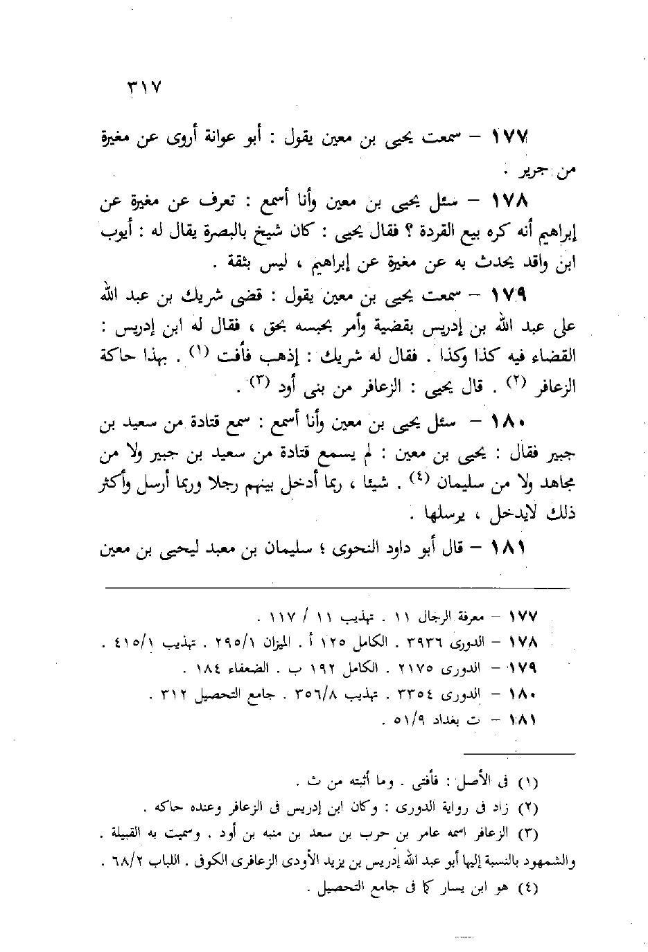 (179) سمعت يحيى بن معين يقول: «قضى شريك بن عبد الله على عبد الله بن إدريس بقضية، وأمر بحبسه بحق، فقال له ابن إدريس: (القضاء فيه كذا وكذا) ، فقال له شريك: (اذهب فأفتِ بهذا حاكةَ الزعافر) » ، قال يحيى: «الزعافر من بني أود» .