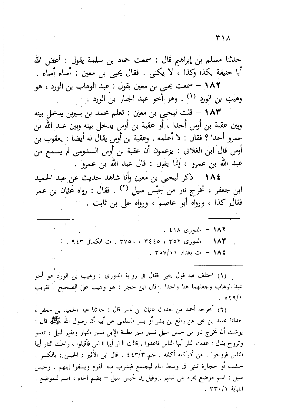 (184) ذكر ليحيى بن معين وأنا شاهد حديث عن عبد الحميد بن جعفر: (تخرج نار من حبس سيل) ، فقال: «رواه عثمان بن عمر، فقال كذا، ورواه أبو عاصم، ورواه علي بن ثابت» ،