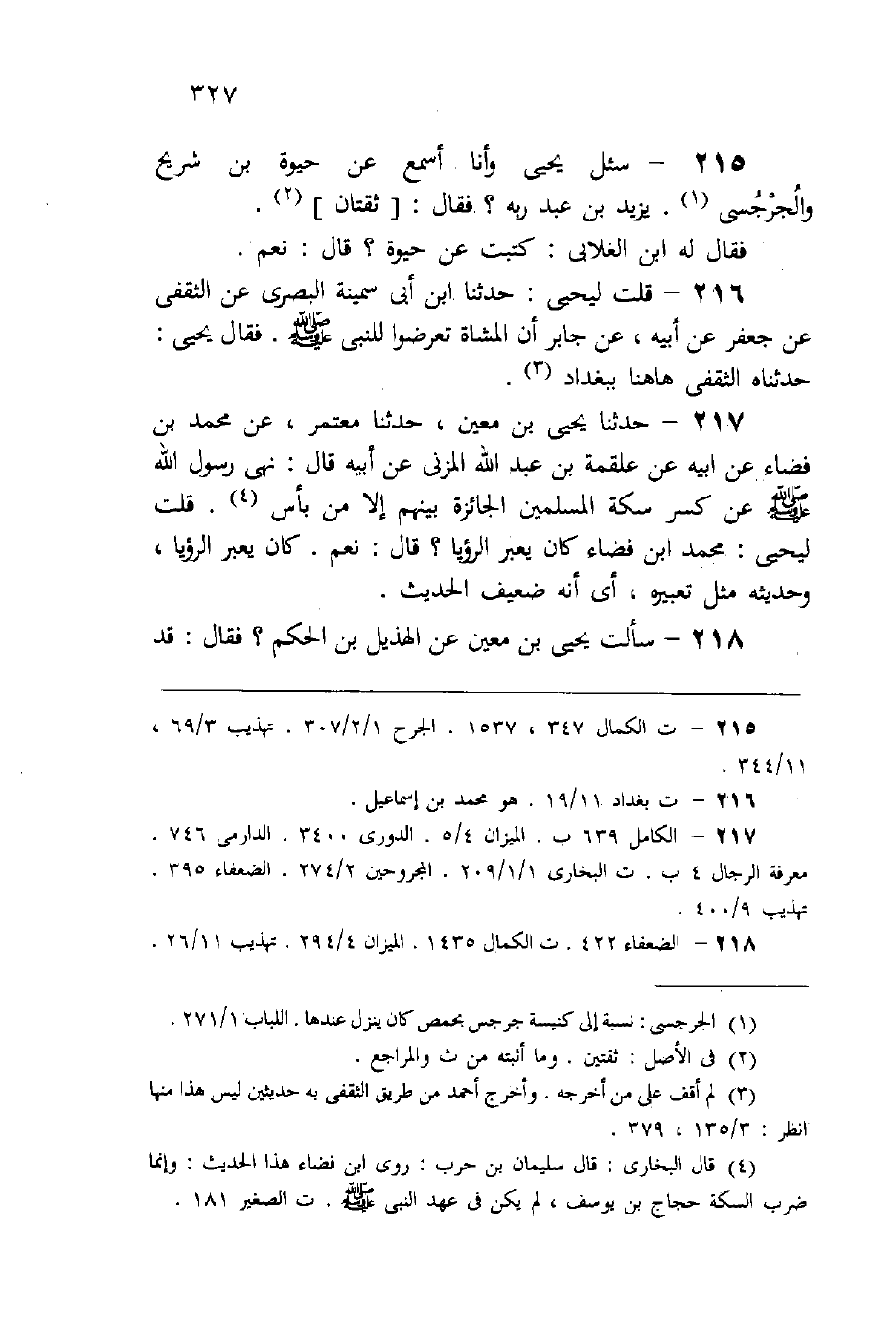 (217) حدثنا يحيى بن معين، حدثنا معتمر، عن محمد بن فضاء، عن أبيه، عن علقمة بن عبد الله المزني، عن أبيه قال: نهى رسول الله -صلى الله عليه وسلم- عن كسر سكة المسلمين الجائزة عنهم إلا من بأس. قلت ليحيى: محمد بن فضاء كان يعبر الرؤيا؟ قال: «نعم، كان يعبر الرؤيا، وحديثه مثل تعبيره» ، أي: أنه ضعيف الحديث.