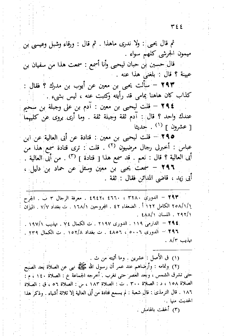 (295) قلت ليحيى بن معين: قتادة عن أبي العالية عن ابن عباس: (أخبرني رجال مرضيون) ، ترى قتادة سمع هذا من أبي العالية؟ قال: «نعم، قد سمع هذا قتادة من أبي العالية» .