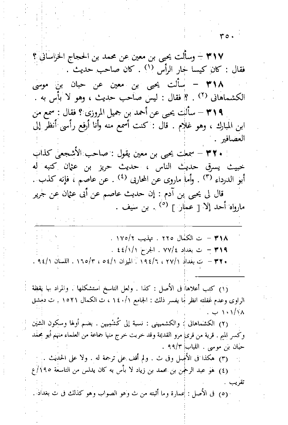 (320) سمعت يحيى بن معين يقول: «صاحب الأشجعي كذاب خبيث، يسرق حديث الناس، حديث حريز بن عثمان كتبه لنا أبو الدرداء، وأما ما روى عن المحاربي عن عاصم فإنه كذب، قال لي يحيى بن آدم: (إن حديث عاصم عن أبي عثمان عن جرير ما رواه أحد إلا عمار بن سيف) » ،