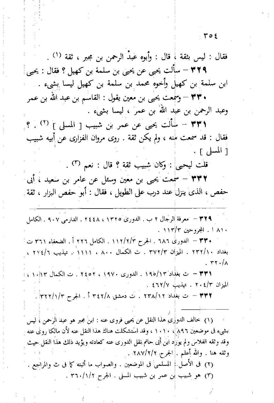 (331) سألت يحيى عن عمر بن شبيب المسلي، فقال: «قد سمعت منه، ولم يكن ثقة، روى مروان الفزاري عن أبيه شبيب المسلي» . قلت ليحيى: وكان شبيب ثقة؟ قال: «نعم» .
