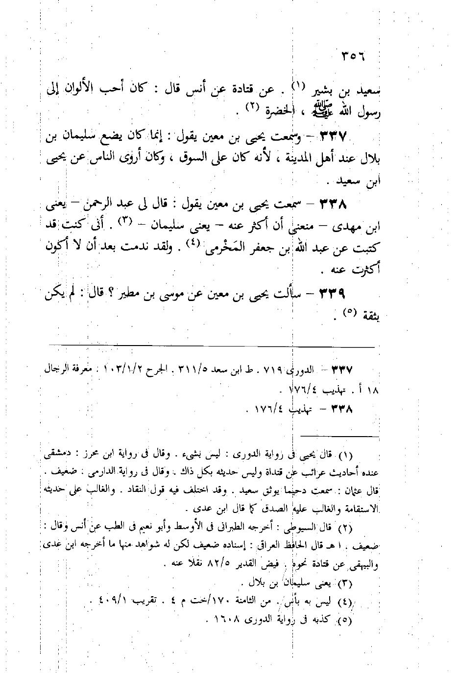 (337) وسمعت يحيى بن معين يقول: «إنما كان يضع سليمان بن بلال عند أهل المدينة لأنه كان على السوق، وكان أروى الناس عن يحيى بن سعيد» .
