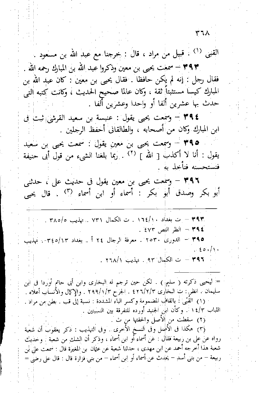 (393) سمعت يحيى بن معين وذكروا عبد الله بن المبارك -رحمه الله-، فقال رجل: إنه لم يكن حافظًا، فقال يحيى: «كان عبد الله بن المبارك كيسًا مستثبتًا ثقة، وكان عالمًا صحيح الحديث، وكانت كتبه التي حدث بها عشرين ألفًا أو واحدًا وعشرين ألفًا» .