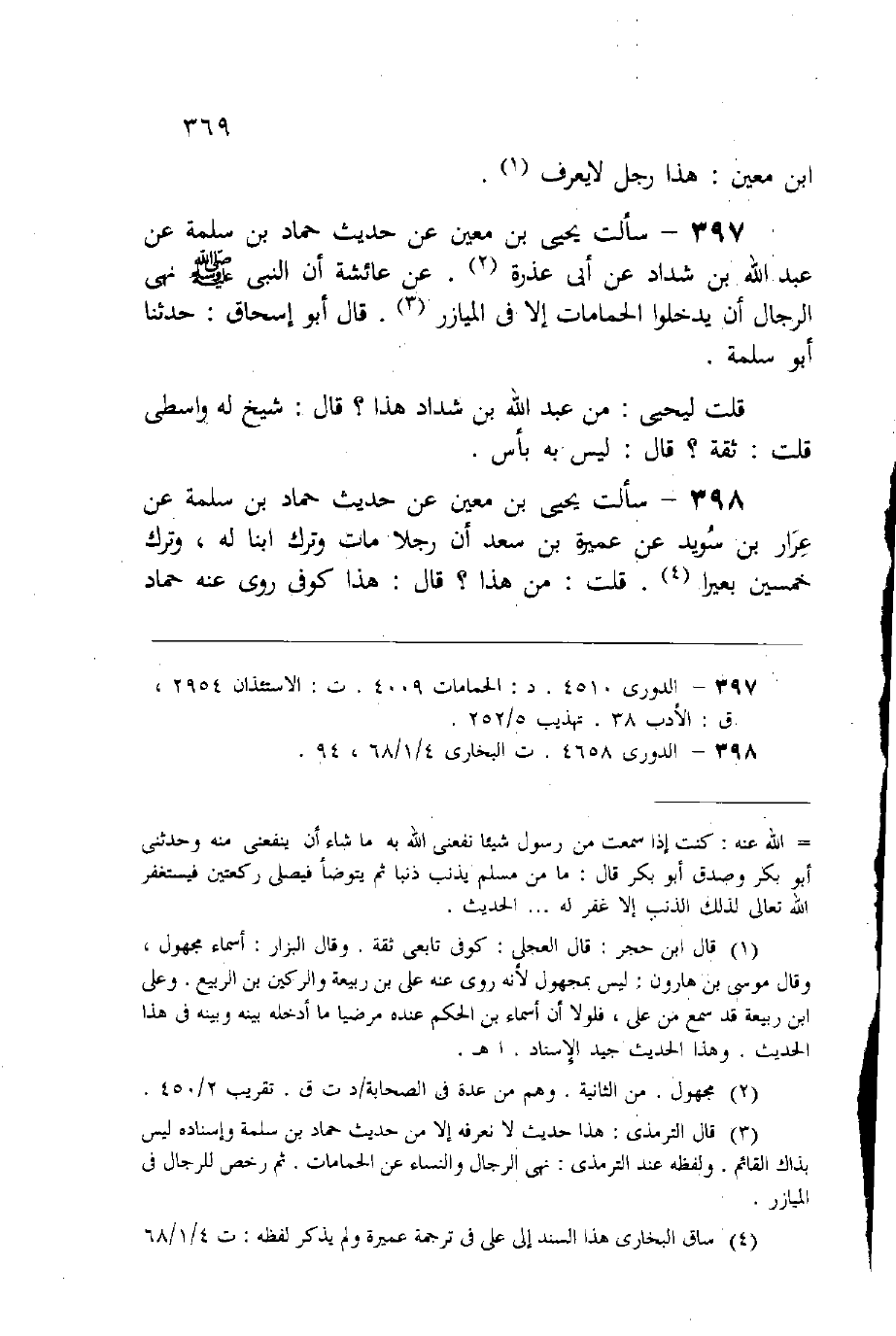 (397) سألت يحيى بن معين عن حديث حماد بن سلمة، عن عبد الله بن شداد، عن أبي عذرة، عن عائشة، أن النبي -صلى الله عليه وسلم- نهى الرجال أن يدخلوا الحمامات إلا في الميازر. قال أبو إسحاق: حدثنا أبو سلمة.
