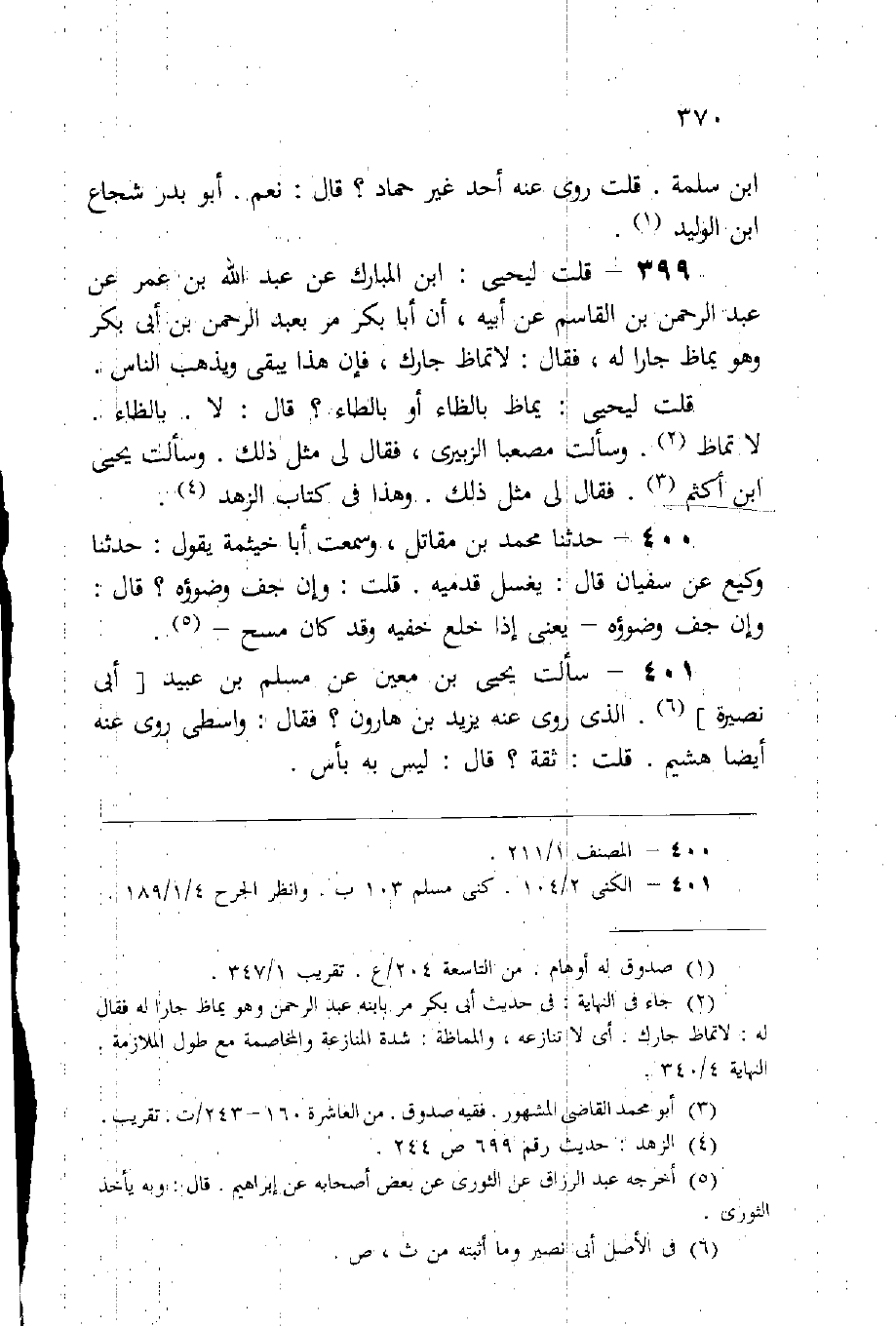 (401) سألت يحيى عن مسلم بن عبيد أبي نصيرة الذي روى عنه يزيد بن هارون، فقال: «واسطي، روى عنه أيضًا هشيم» ، قلت: ثقة؟ قال: «ليس به بأس» .