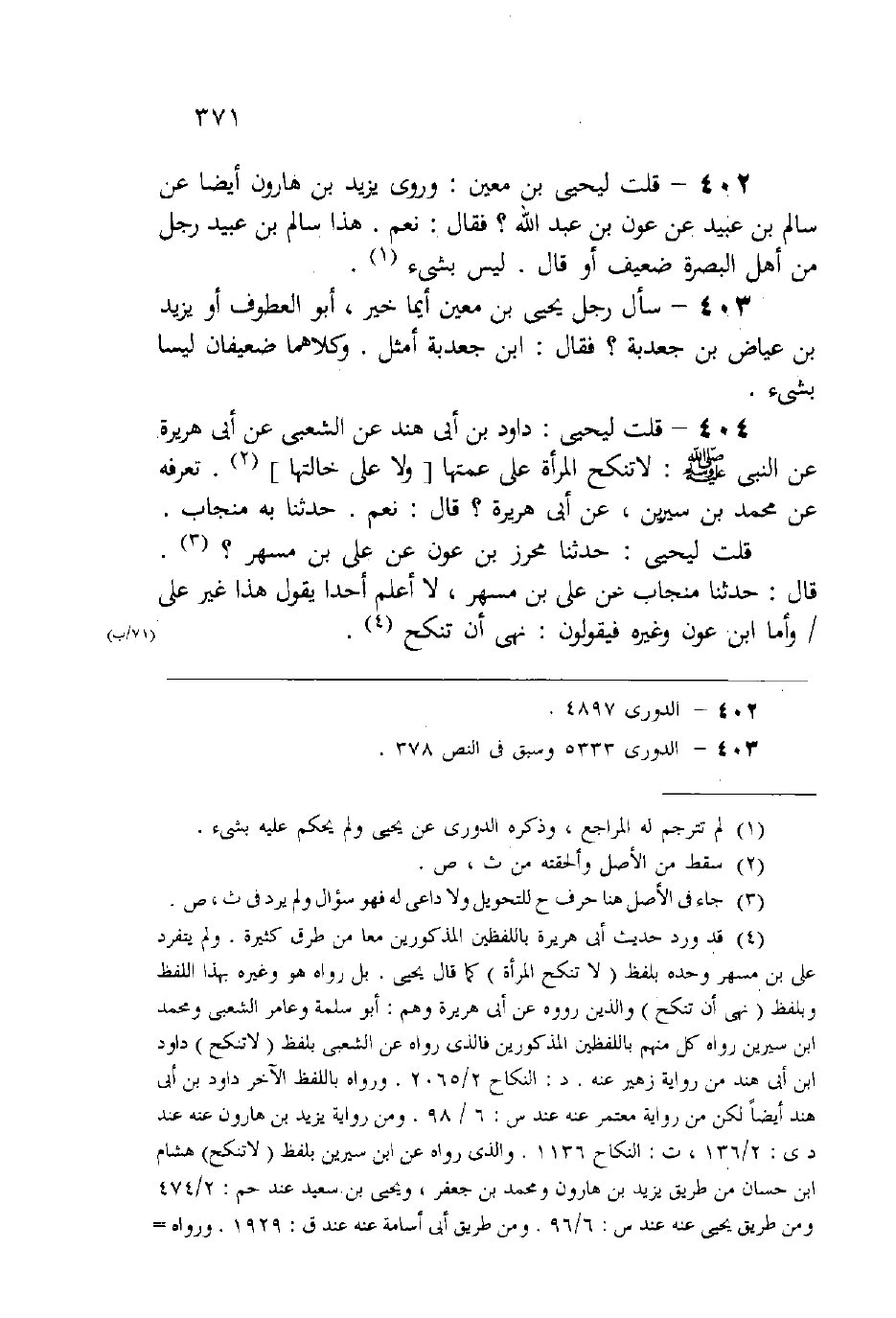 (404) قلت ليحيى: داود بن أبي هند، عن الشعبي، عن أبي هريرة، عن النبي -صلى الله عليه وسلم-: «لا تنكح المراة على عمتها ولا على خالتها» ، تعرفه عن محمد بن سيرين، عن أبي هريرة؟ قال: «نعم، حدثنا به منجاب» .