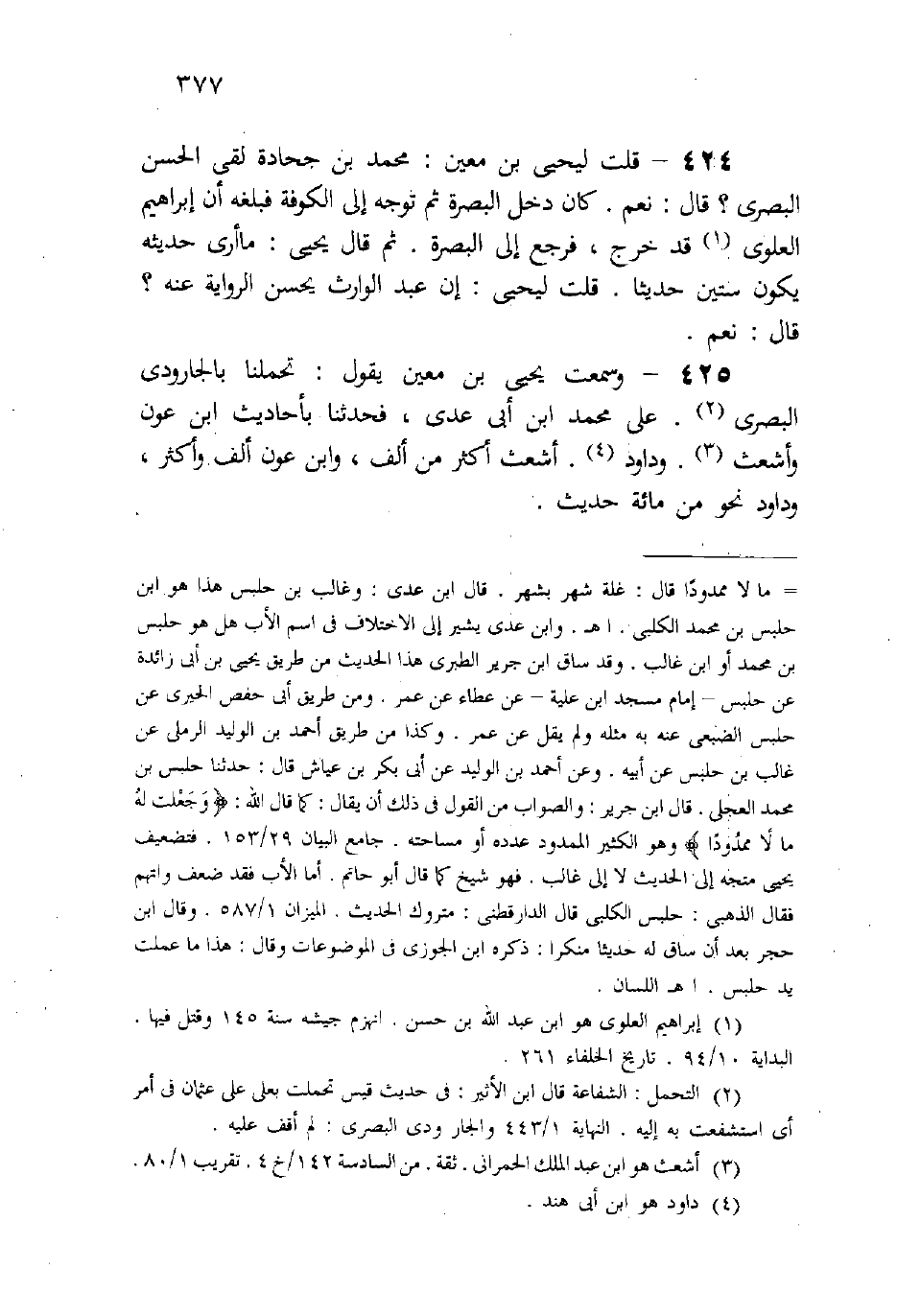 (425) سمعت يحيى بن معين يقول: «تحملنا بالجارودي البصري على محمد ابن أبي عدي، فحدثنا بأحاديث ابن عون وأشعث وداود، أشعث أكثر من ألف، وابن عون ألف وأكثر، وداود نحو من مائة حديث» .