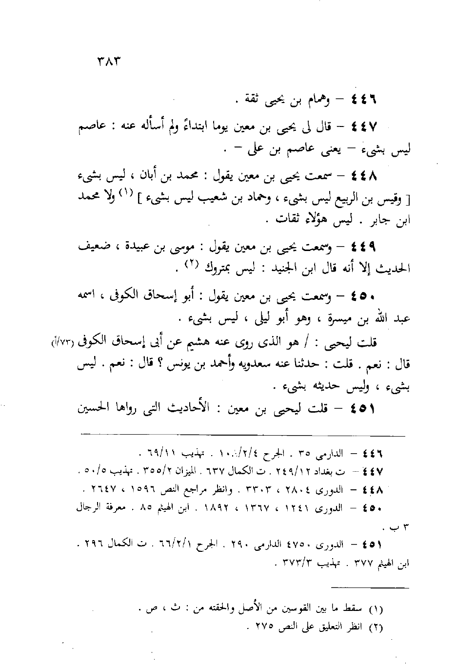 (448) سمعت يحيى بن معين يقول: «محمد بن أبان ليس بشيء، وقيس بن الربيع ليس بشيء، وحماد بن شعيب ليس بشيء، ولا محمد بن جابر، ليس هؤلاء ثقات» .
