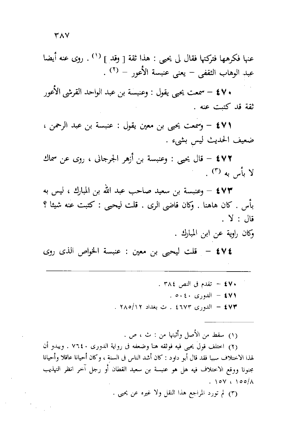 (471) وسمعت يحيى بن معين يقول: «عنبسة بن عبد الرحمن ضعيف الحديث ليس بشيء» .